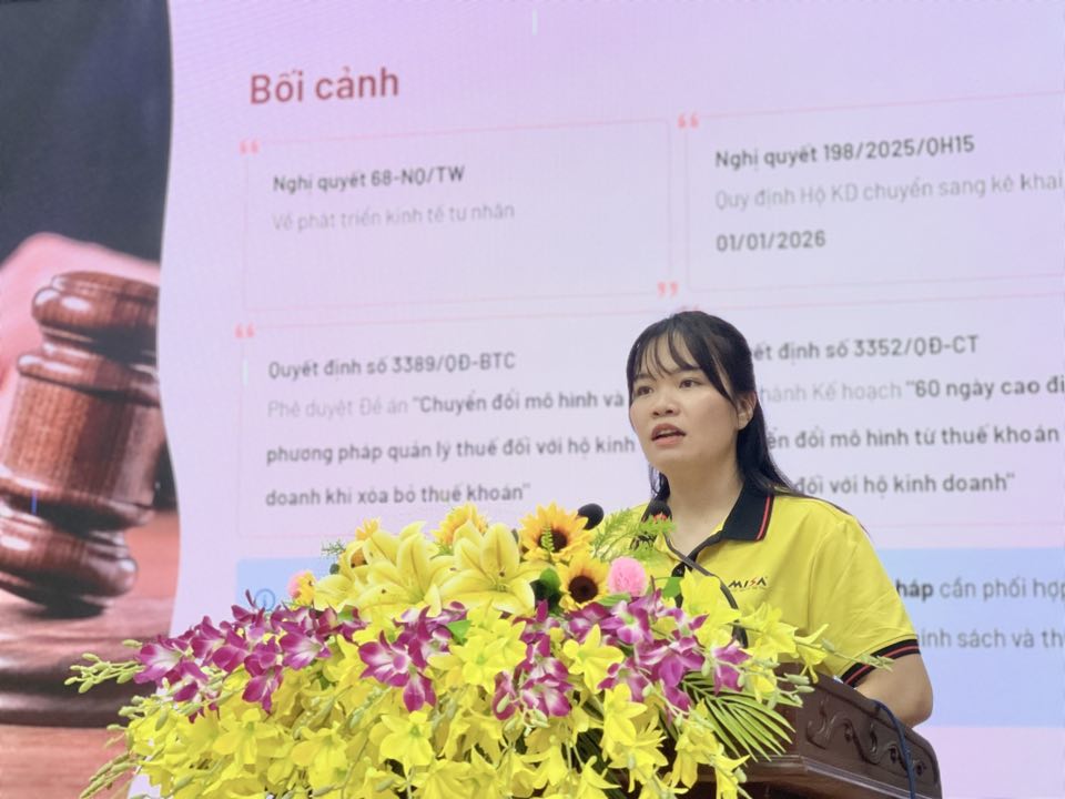 Tại Hội nghị, đại diện Cục Thuế tỉnh Hà Tĩnh đã trình bày, phân tích rõ các nội dung trọng tâm trong kế hoạch chuyển đổi mô hình thuế; hướng dẫn cụ thể quy trình kê khai, khai báo thuế trên nền tảng công nghệ số; đồng thời giải đáp thắc mắc của các hộ kinh doanh để việc thực hiện đạt hiệu quả, đúng quy định.
