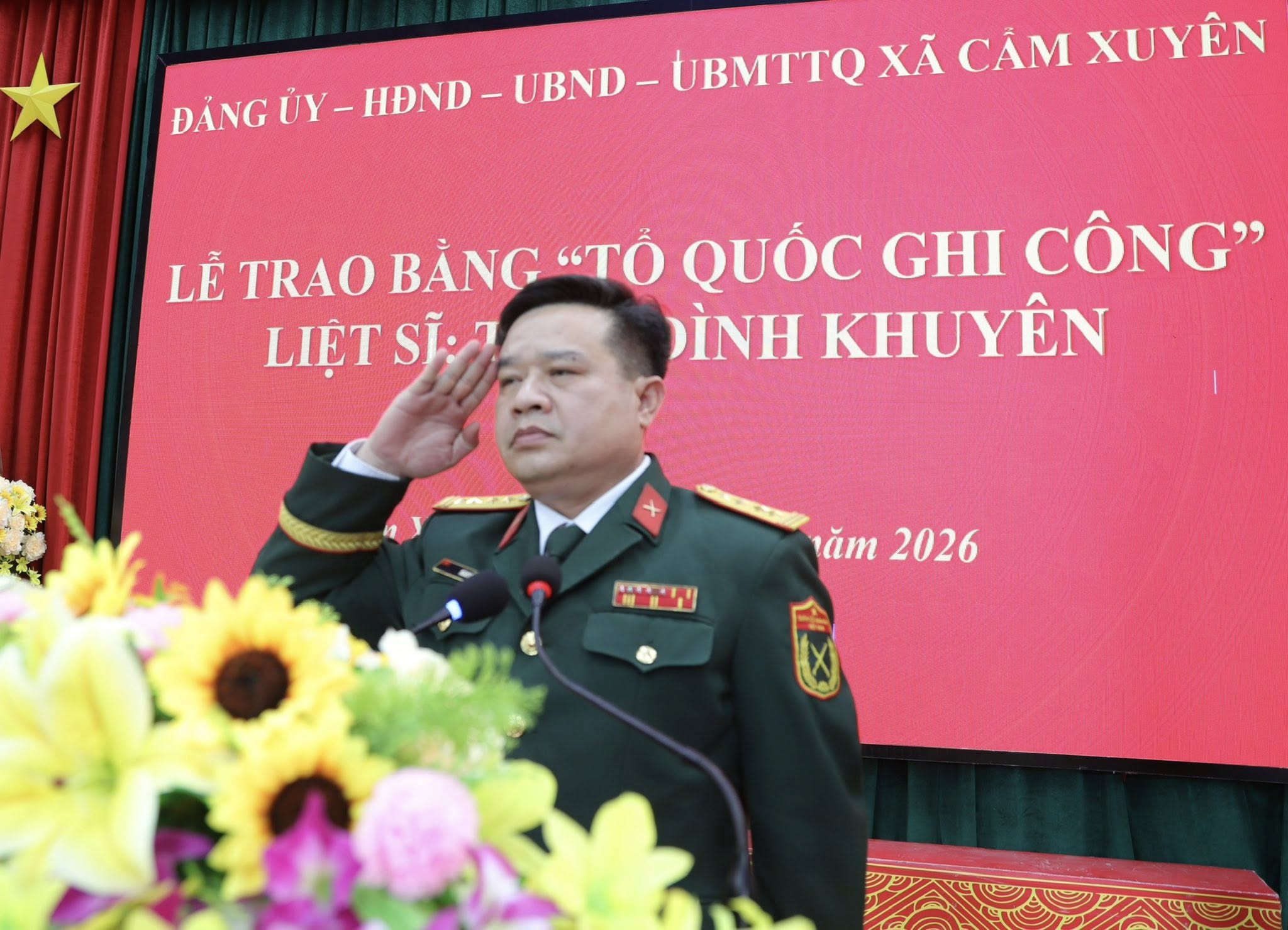 Chiều 30/3/2026, Đảng ủy – HĐND – UBND – Ủy ban MTTQ Việt Nam xã Cẩm Xuyên, tỉnh Hà Tĩnh long trọng tổ chức Lễ trao Bằng “Tổ quốc ghi công” Liệt sĩ Trần Đình Khuyên. Tham dự buổi lễ, về phía Bộ Chỉ huy Quân sự tỉnh Hà Tĩnh có đồng chí Đại tá Nguyễn Hà – Phó Chủ nhiệm Chính trị Bộ CHQS tỉnh; đồng chí Thiếu tá Hà Huy Liệu – Phó Chủ nhiệm Phòng Chính trị, Ban Chỉ huy Phòng thủ khu vực 3 Kỳ Anh.