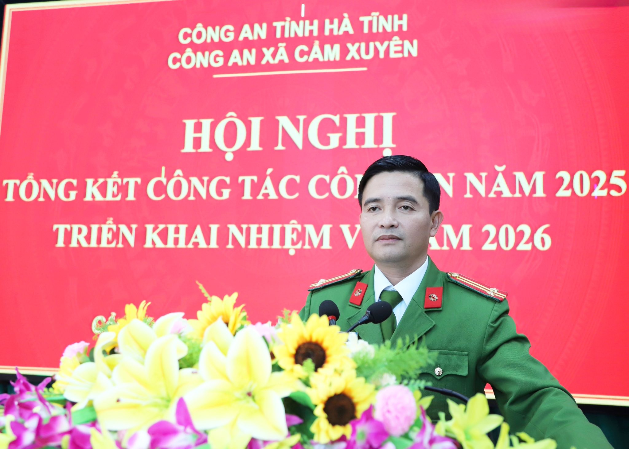 Chiều ngày 1401/2026, công an xã Cẩm Xuyên, tỉnh Hà Tĩnh tổ chức Hội nghị tổng kết công tác Công an và phong trào thi đua "Vì an ninh Tổ quốc" năm 2025, triển khai nhiệm vụ năm 2026. Tham dự hội nghị về phía Công an tỉnh có lãnh đạo và đại diện các phòng nghiệp vụ: Văn phòng Cơ quan Cảnh sát điều tra; Phòng Tổ chức cán bộ; Phòng Công tác đảng và công tác chính trị; Phòng Thanh tra Công an tỉnh; Đại diện lãnh đạo Tòa án nhân dân khu vực I; Viện kiểm sát nhân dân khu vực I, tỉnh Hà Tĩnh; Đại diện lãnh đạo Trung đoàn 841. Về phía xã có đồng chí Nguyễn Văn Thành - Tỉnh uỷ viên, Bí thư Đảng uỷ, Chủ tịch HĐND xã; đồng chí Phan Trọng Bình - Phó Bí thư Đảng uỷ, Chủ tịch UBND xã; đồng chí Nguyễn Thị Mai - Uỷ viên BTV, Chủ tịch Uỷ ban MTTQ Việt Nam xã; đồng chí Trung tá Hà Huy Hưng - Uỷ viên BTV, Trưởng công an xã; Ban Chỉ huy Quân sự xã; các phòng, ngành cấp xã; cùng các đồng chí cán bộ, chiến sỹ Công an xã.