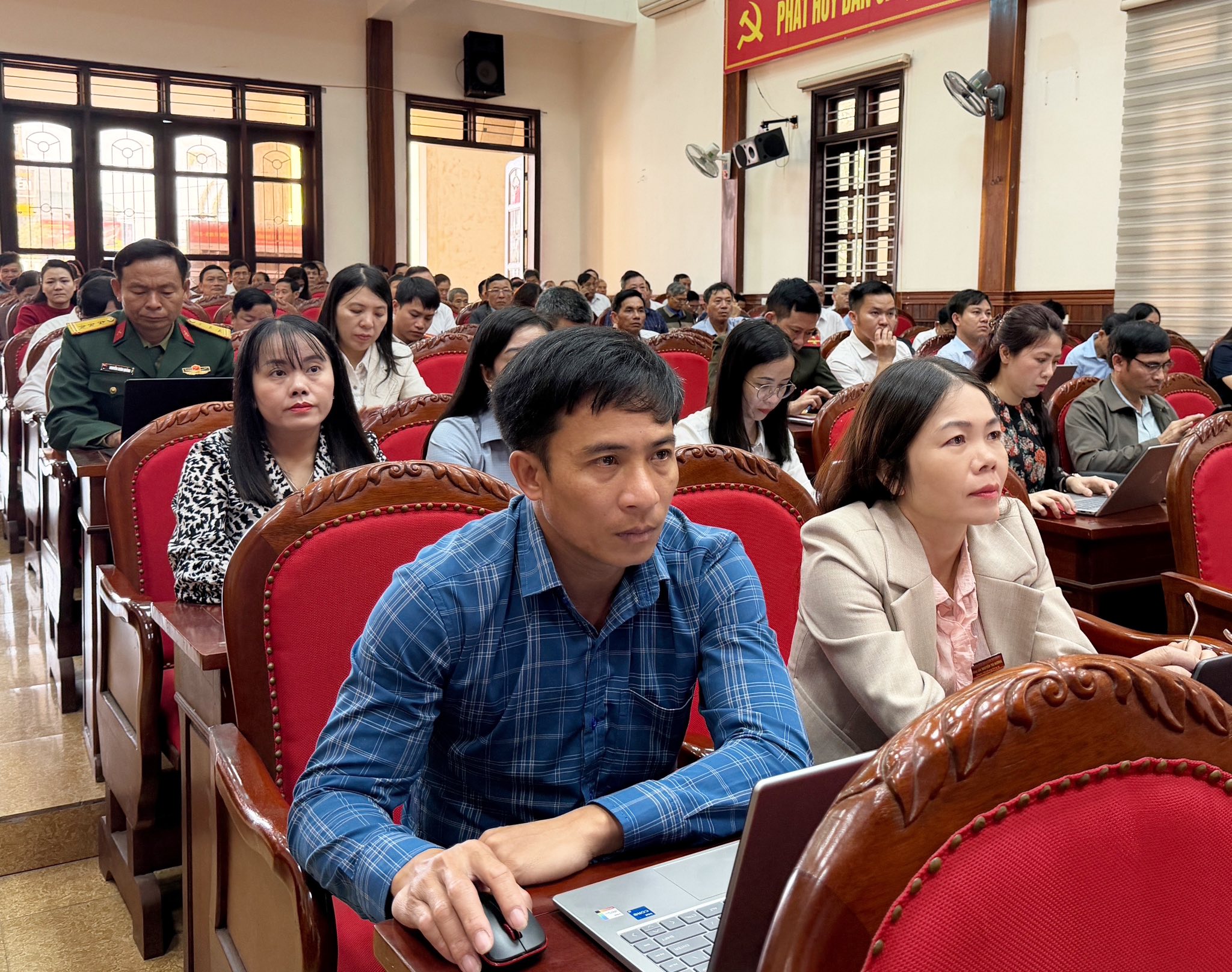 Tham dự tại điểm cầu xã Cẩm Xuyên có đồng chí Phạm Văn Đan - Phó Bí thư Thường trực Đảng uỷ xã; đồng chí Phan Trọng Bình - Phó Bí thư Đảng uỷ, Chủ tịch UBND xã; cùng các đồng chí trong Thường trực Đảng ủy, HĐND, lãnh đạo UBND, Ủy ban MTTQ, thành viên Ban Chỉ đạo, Ủy ban bầu cử xã, cán bộ, công chức và các đồng chí Bí thư Chi bộ, Trường thôn, Tổ trưởng Tổ bầu cử.