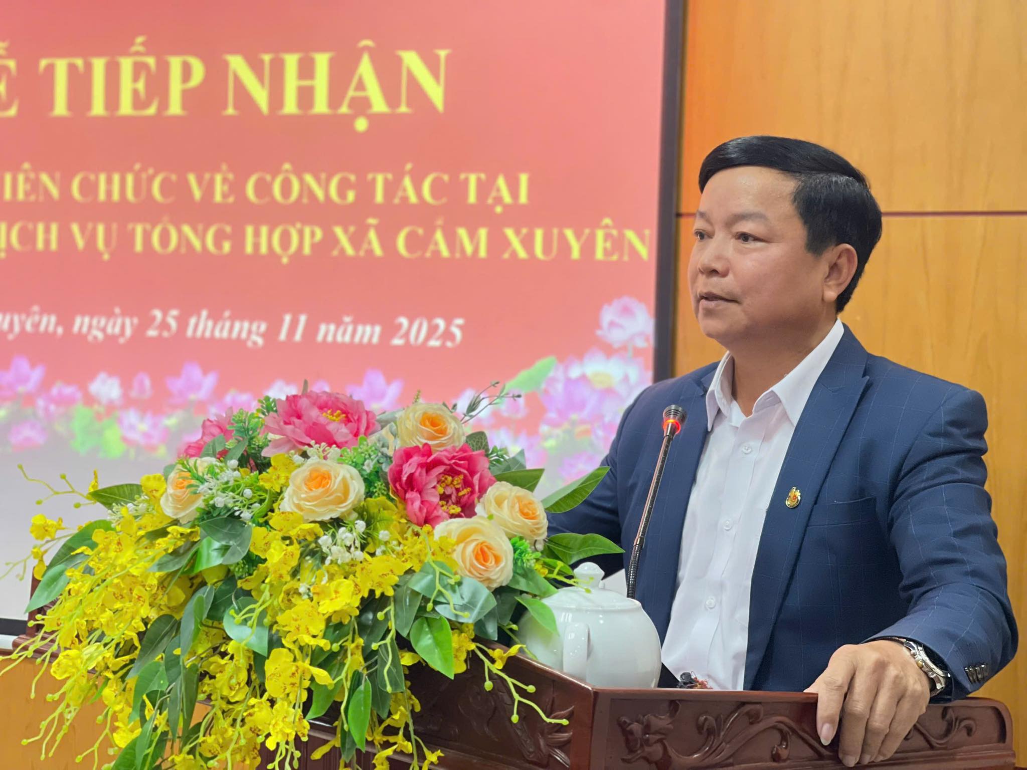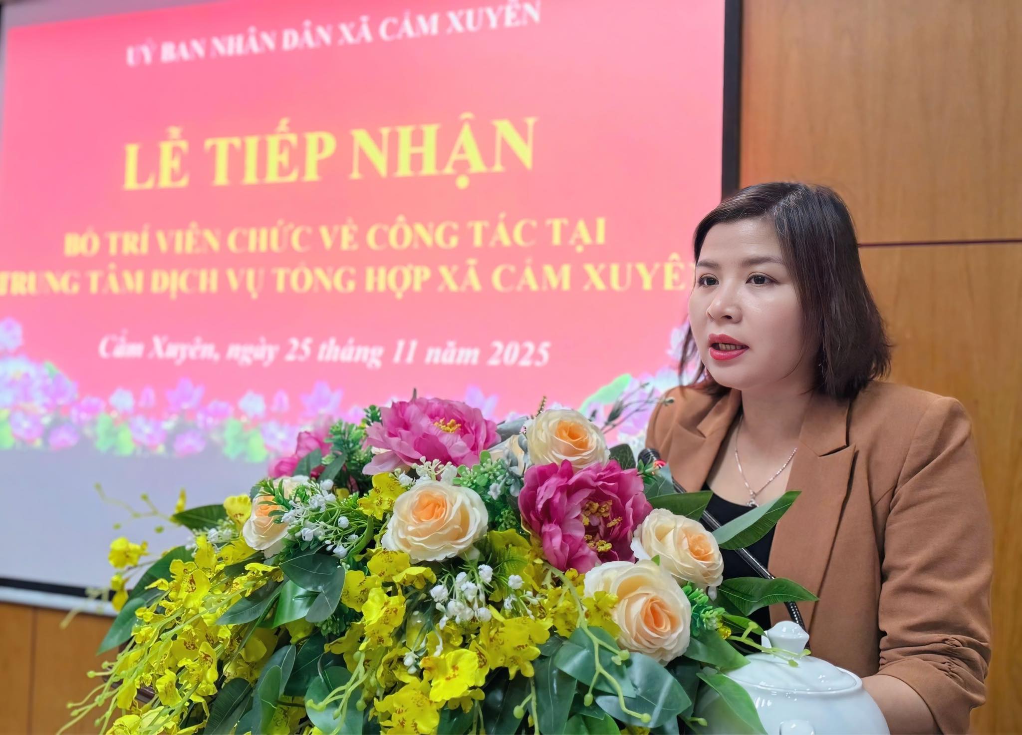 Thực hiện theo Văn bản số 9179/UBND-NC2 của UBND tỉnh về việc điều động viên chức đến công tác tại các Trung tâm Dịch vụ tổng hợp cấp xã, phường. Sáng nay, ngày 25/11/2025, UBND xã Cẩm Xuyên đã long trọng tổ chức Lễ tiếp nhận và bố trí viên chức về công tác tại Trung tâm Dịch vụ tổng hợp xã. Buổi lễ vinh dự có sự tham dự của Đ/c Phan Trọng Bình – Phó Bí thư, Chủ tịch UBND xã; Đ/c Phan Thanh Nghi – Ủy viên BTV, Phó Chủ tịch UBND xã; Đ/c Nguyễn Thị Thủy Nguyệt – Trưởng phòng Văn hóa – Xã hội xã cùng các chuyên viên phụ trách lĩnh vực và các viên chức được điều động về nhận nhiệm vụ mới.