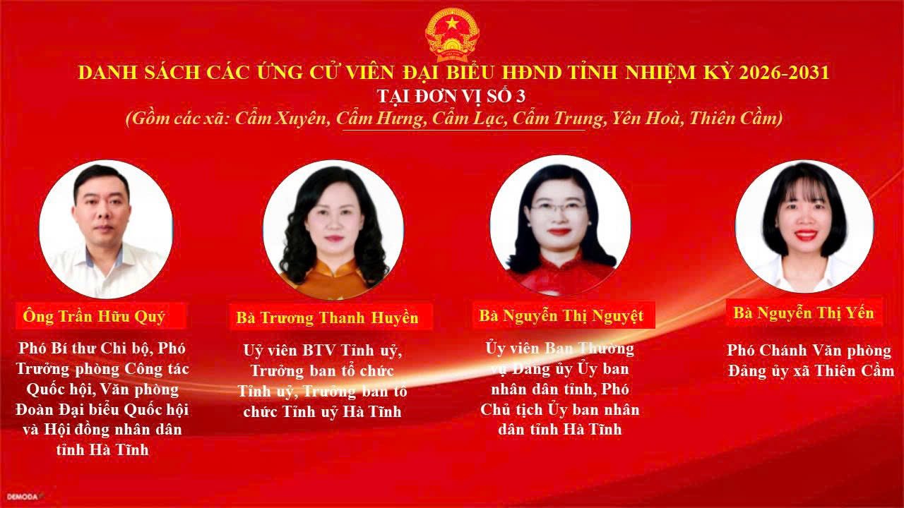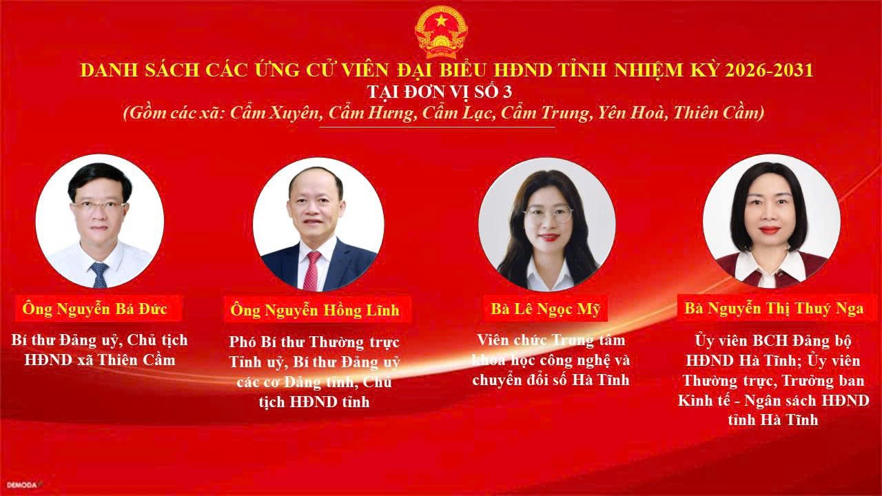 Tại tỉnh Hà Tĩnh, sau Hội nghị hiệp thương lần thứ ba, Ủy ban Bầu cử tỉnh đã công bố danh sách 94 người ứng cử đại biểu HĐND tỉnh khóa XIX tại 12 đơn vị bầu cử. Theo quy định, nhiệm kỳ 2026–2031, tỉnh sẽ bầu 58 đại biểu HĐND tỉnh – những người đại diện cho tiếng nói, quyền lợi và nguyện vọng chính đáng của Nhân dân.
