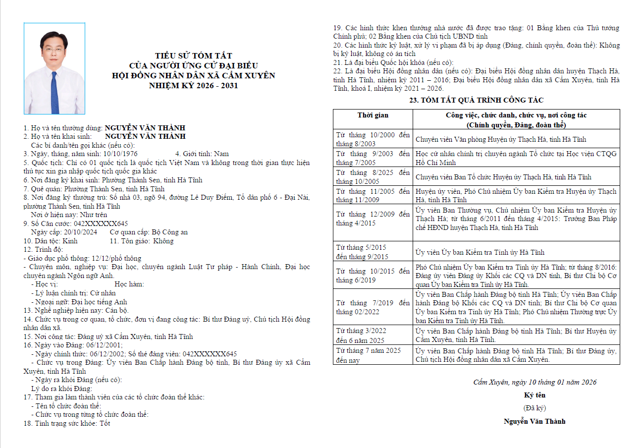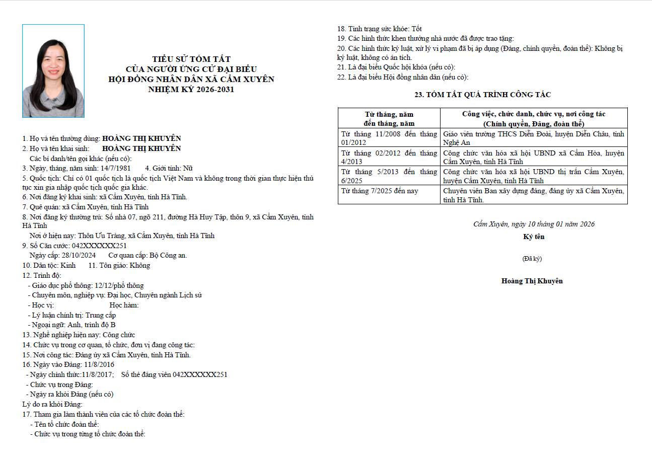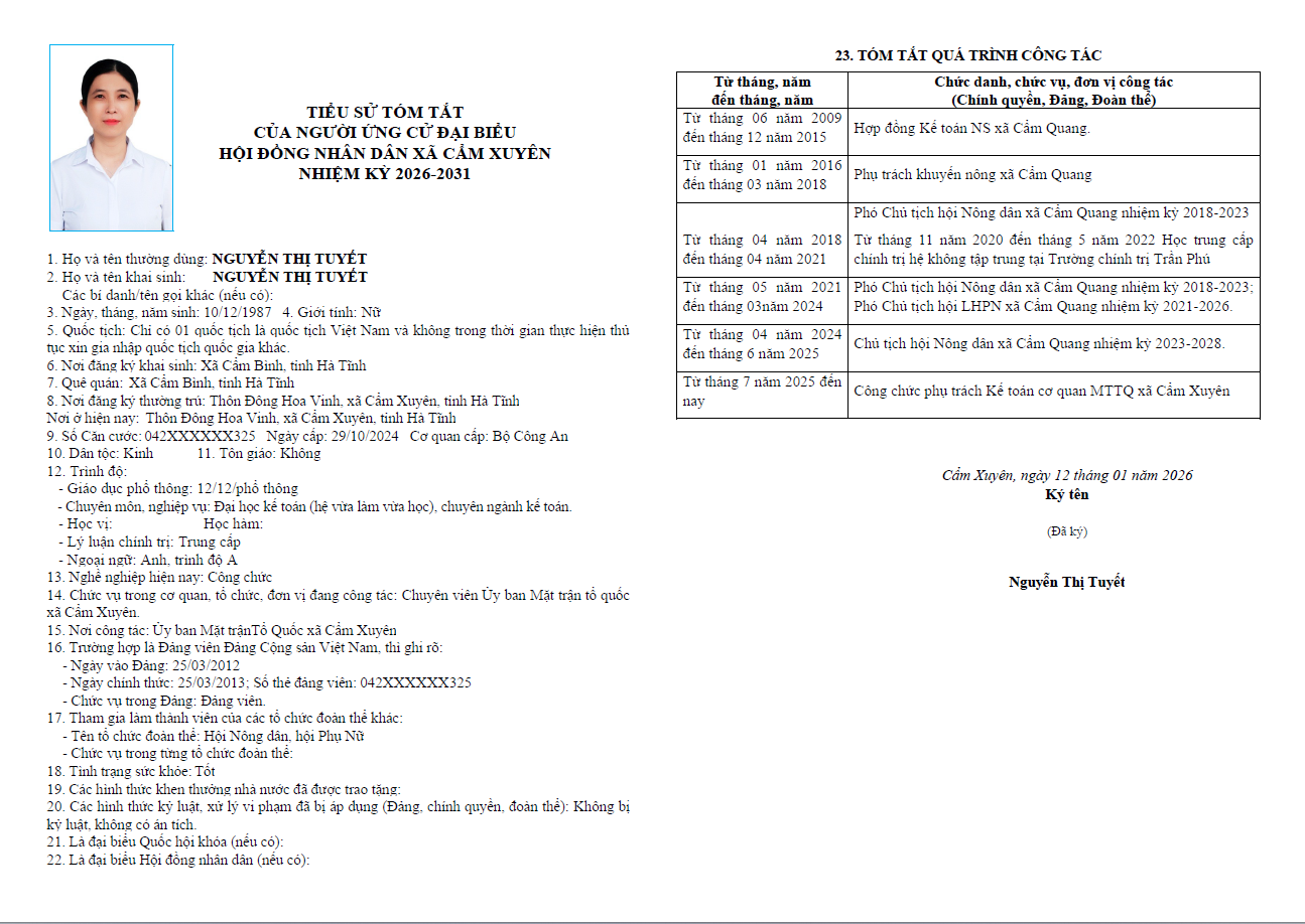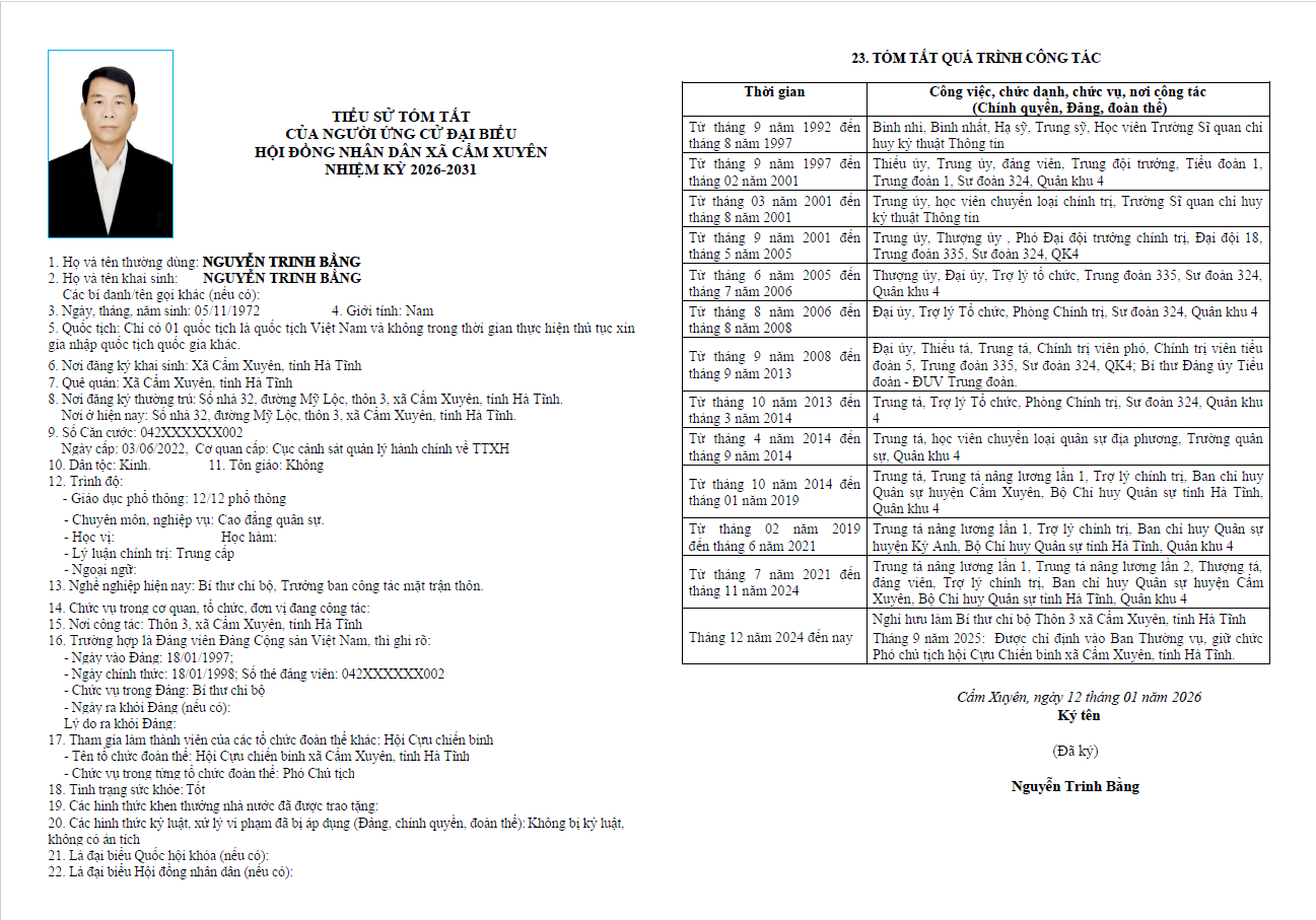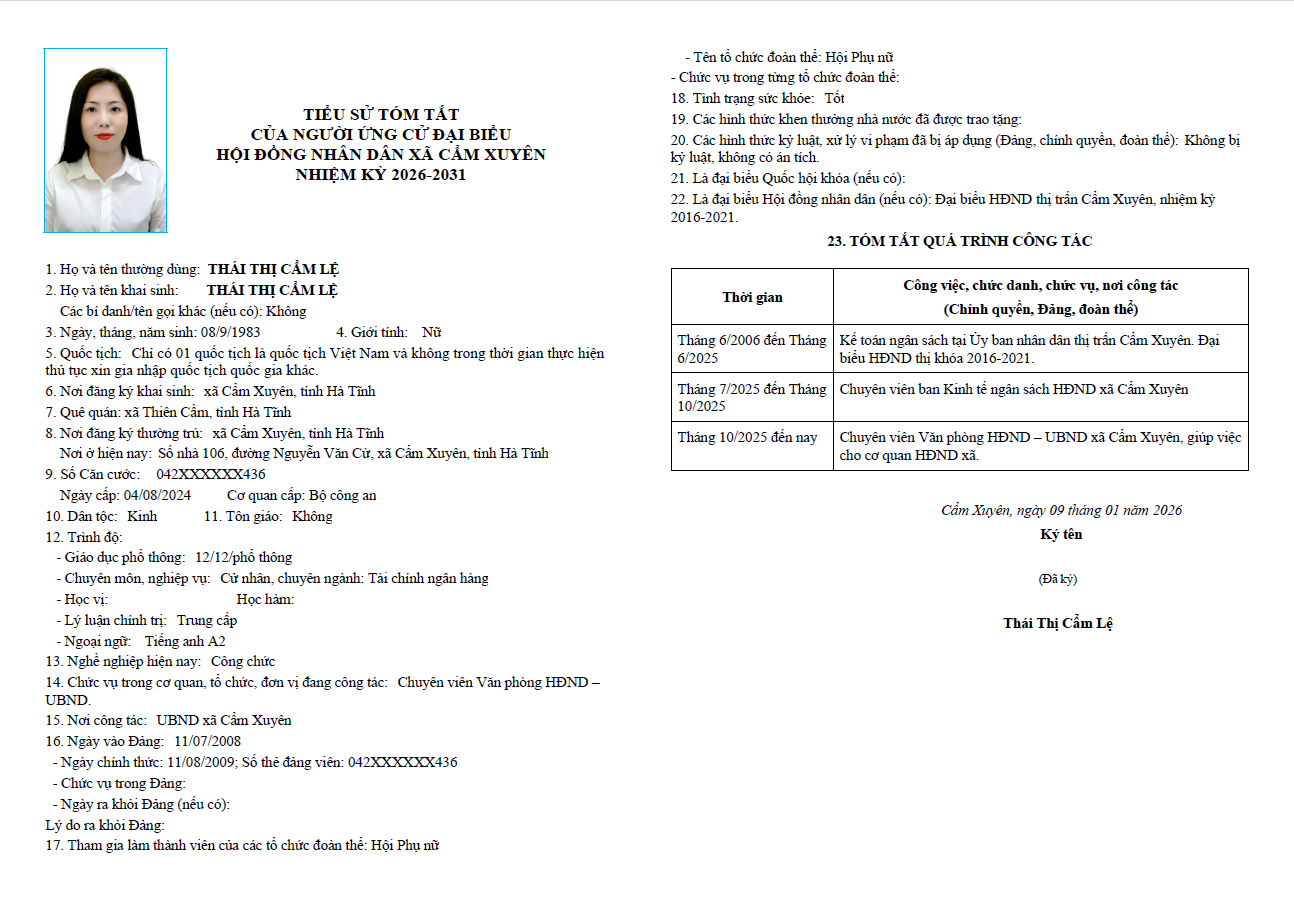 Ủy ban bầu cử xã Cẩm Xuyên niêm yết công khai tiểu sử tóm tắt của 37 người ứng cử Đại biểu HĐND xã Cẩm Xuyên nhiệm kỳ 2026-2031 như sau: