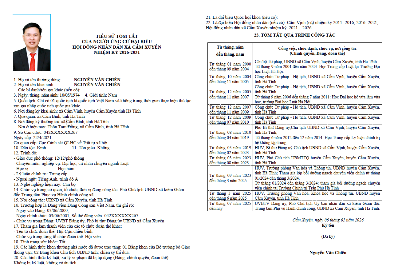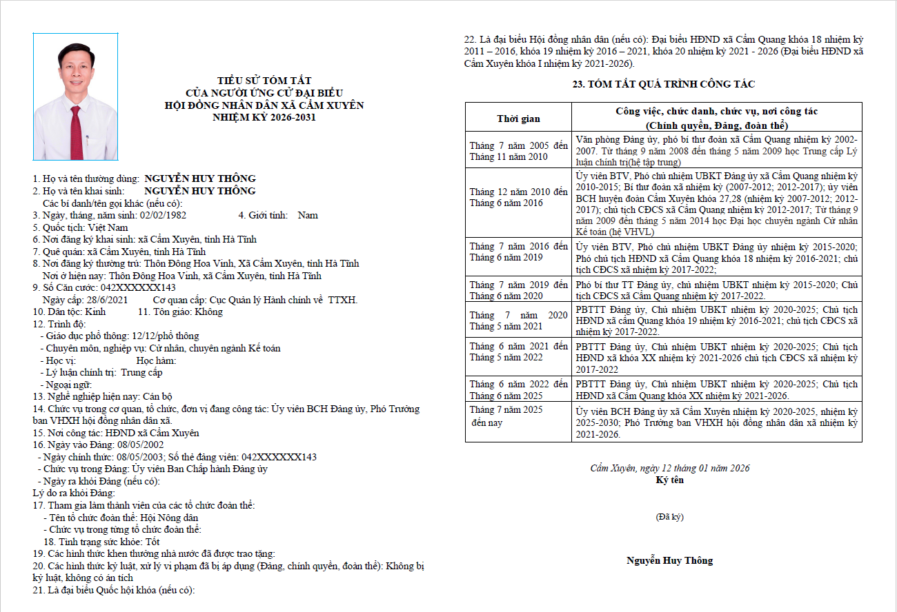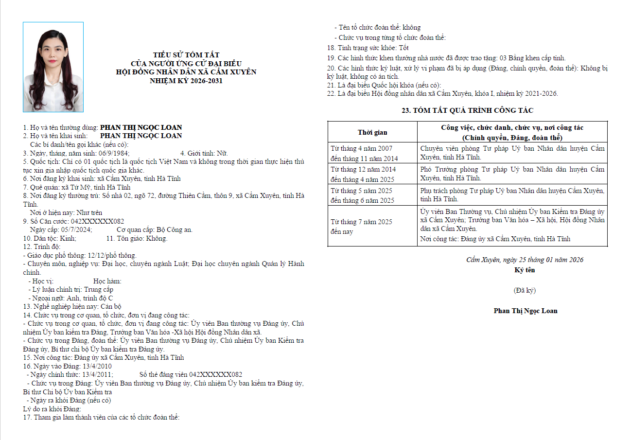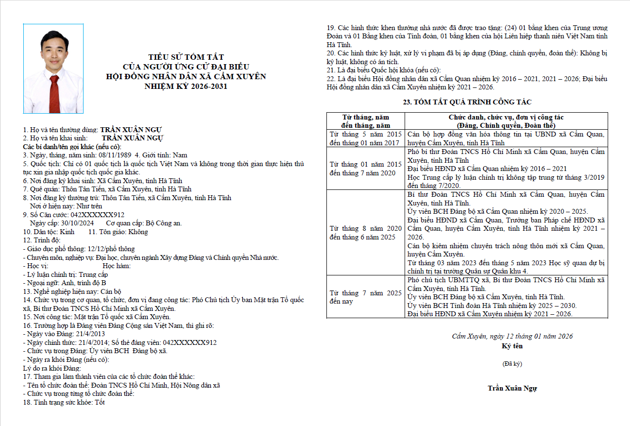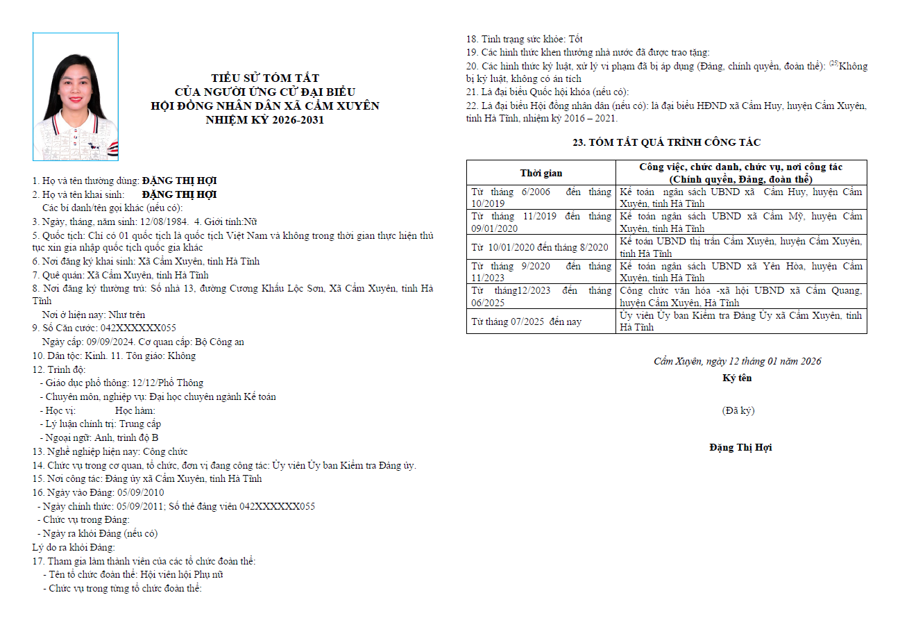Ủy ban bầu cử xã Cẩm Xuyên niêm yết công khai tiểu sử tóm tắt của 37 người ứng cử Đại biểu HĐND xã Cẩm Xuyên nhiệm kỳ 2026-2031 như sau: