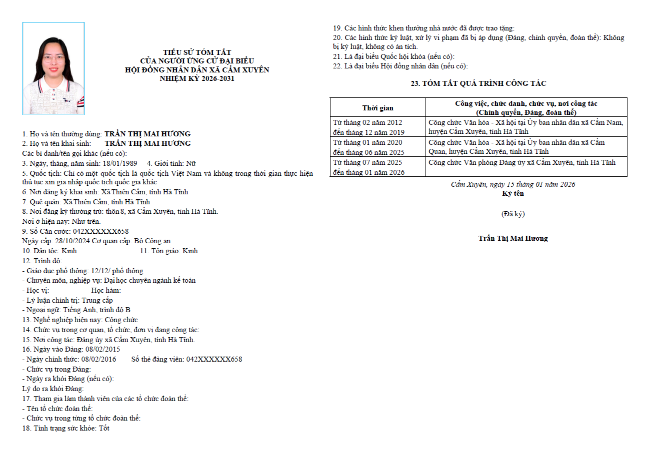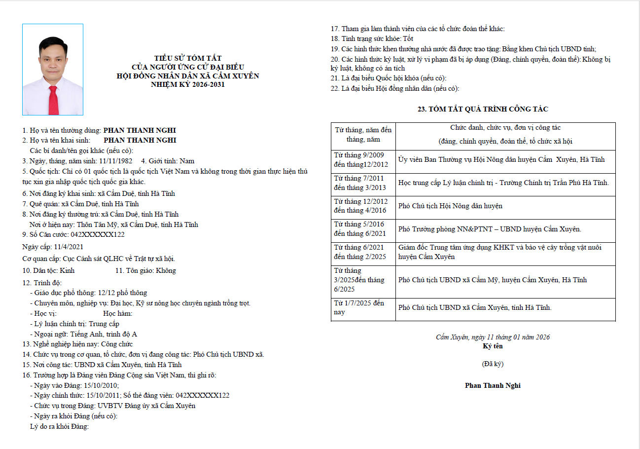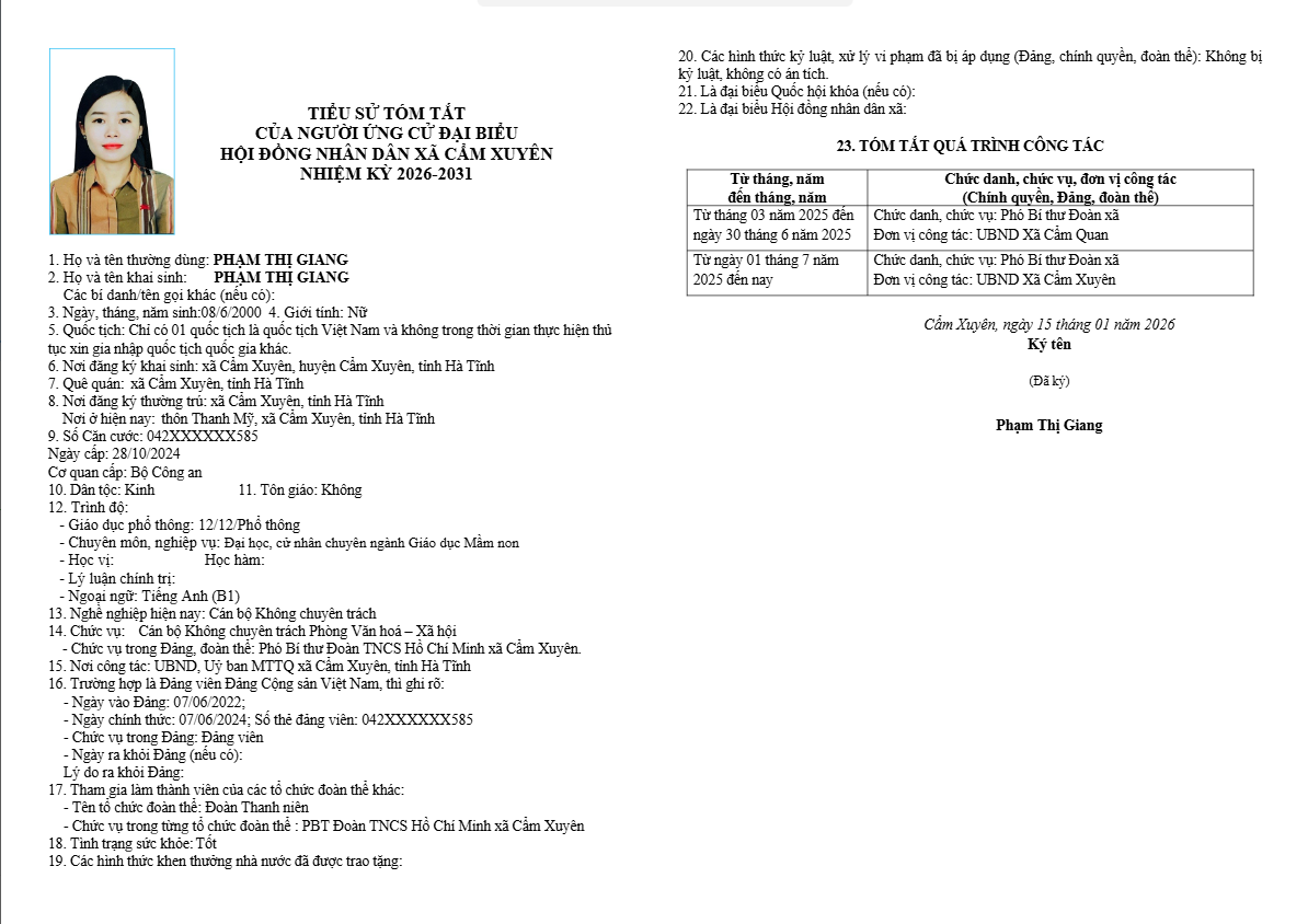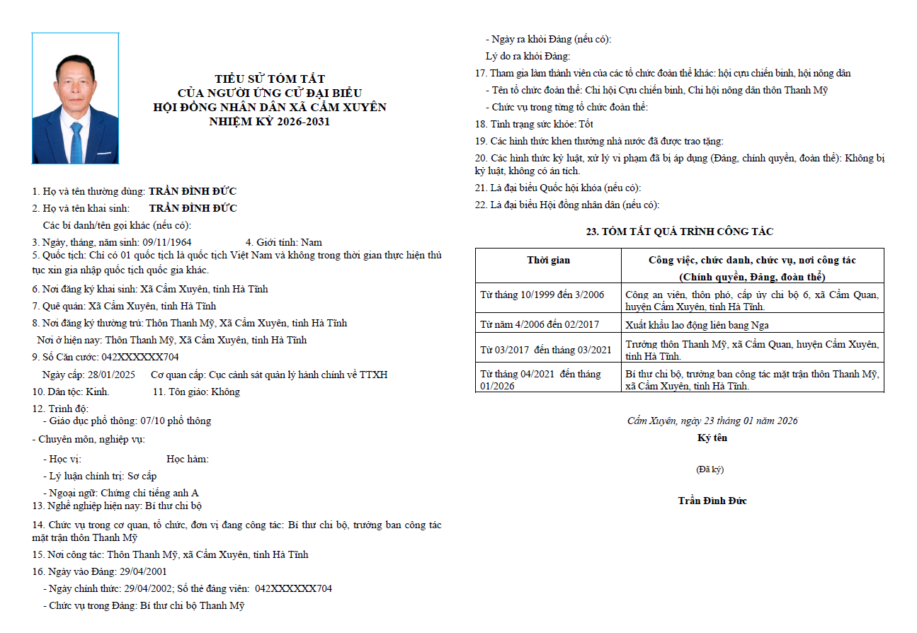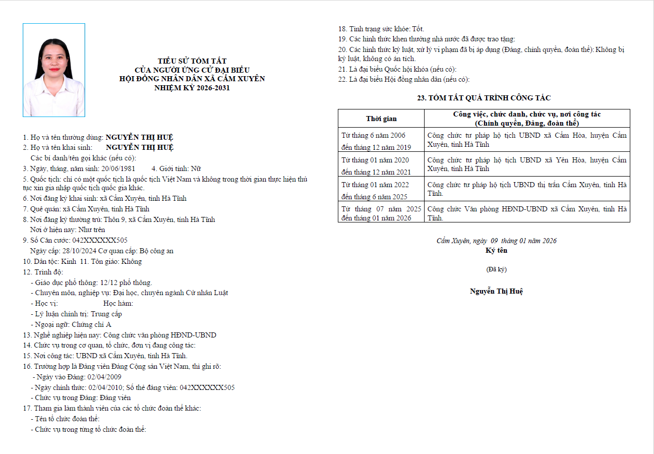 Ủy ban bầu cử xã Cẩm Xuyên niêm yết công khai tiểu sử tóm tắt của 37 người ứng cử Đại biểu HĐND xã Cẩm Xuyên nhiệm kỳ 2026-2031 như sau: