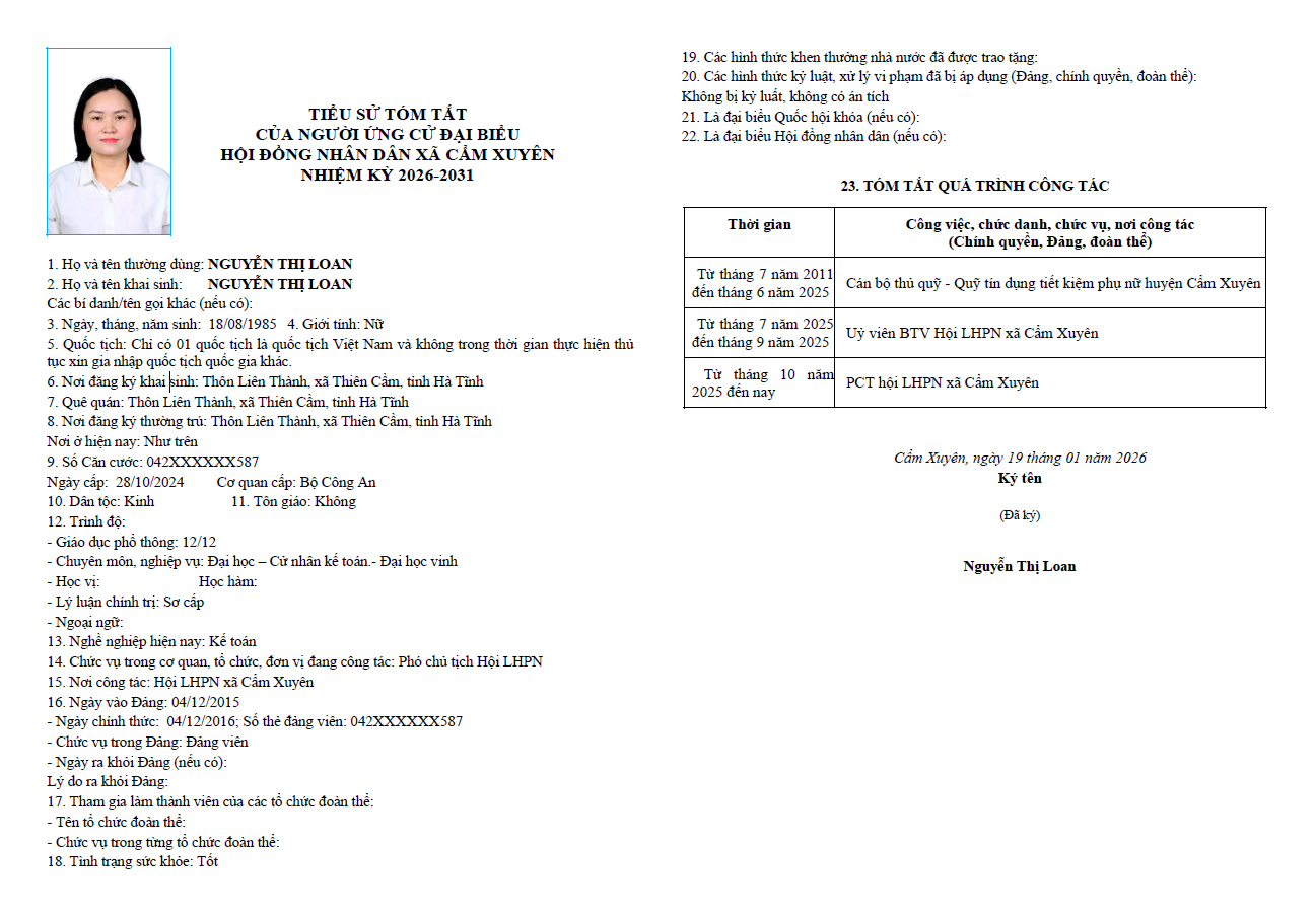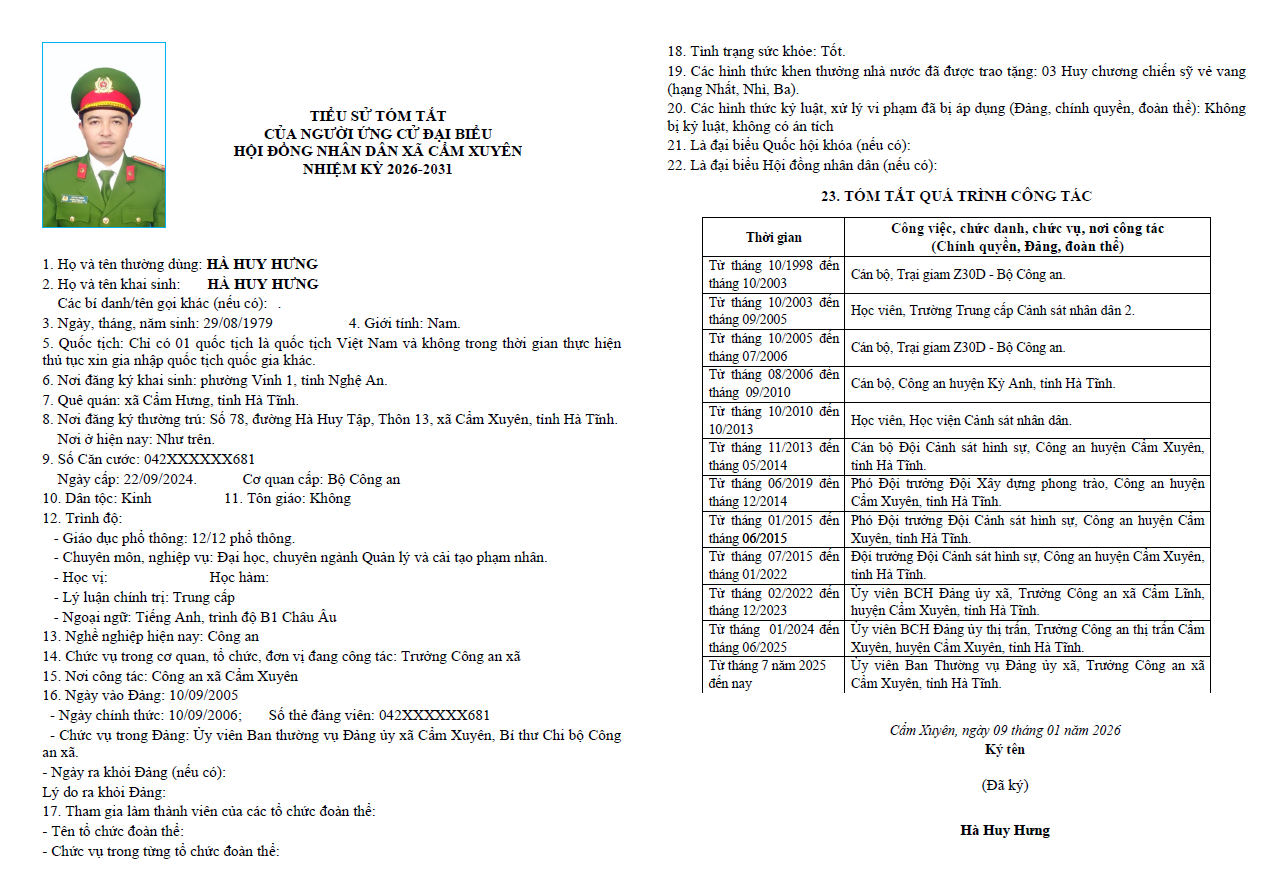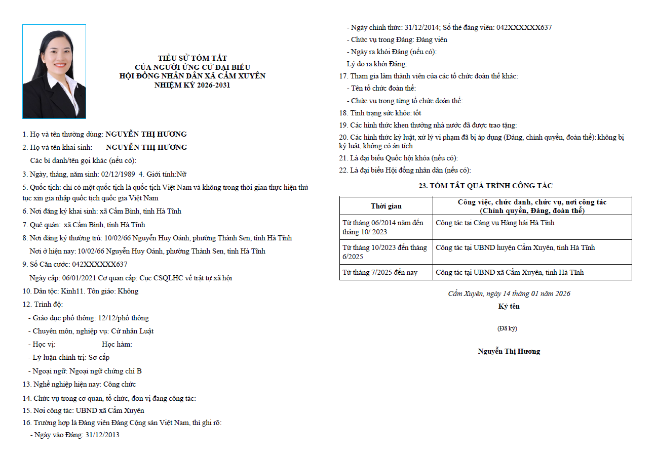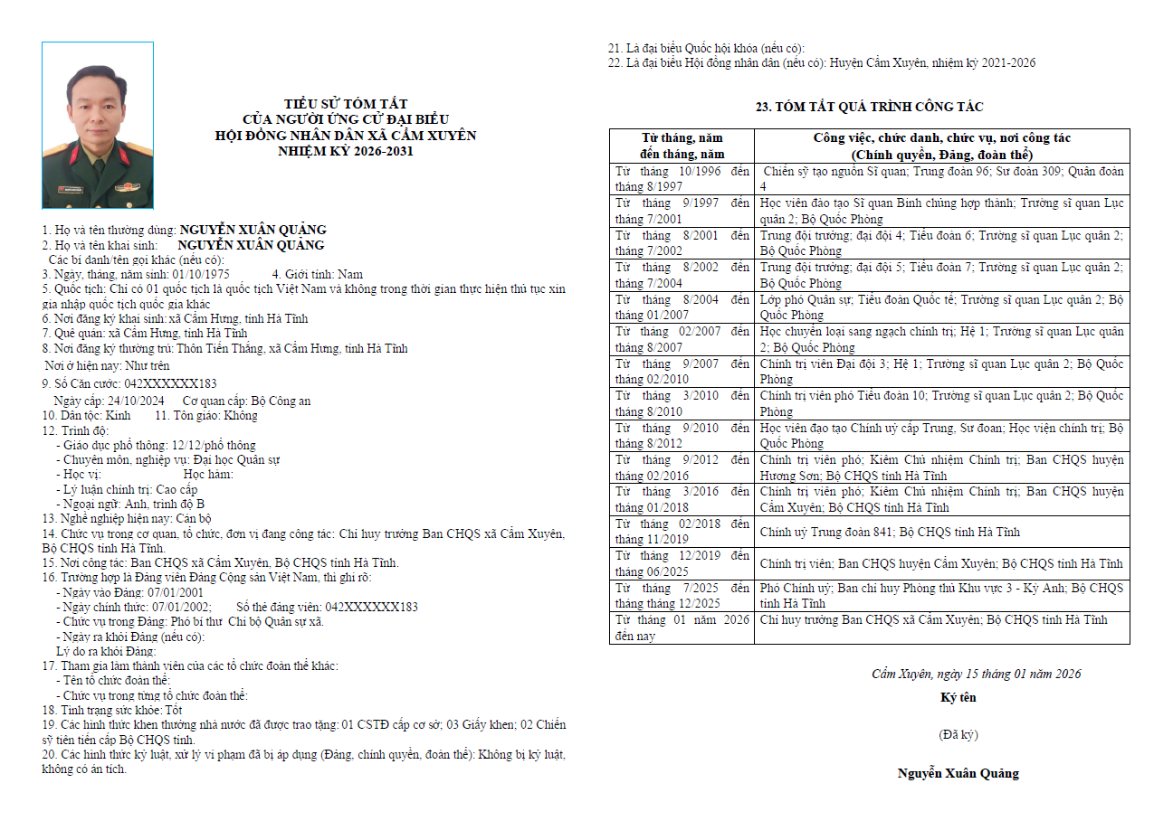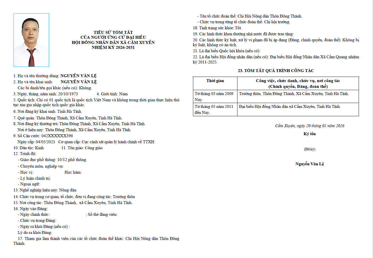 Ủy ban bầu cử xã Cẩm Xuyên niêm yết công khai tiểu sử tóm tắt của 37 người ứng cử Đại biểu HĐND xã Cẩm Xuyên nhiệm kỳ 2026-2031 như sau: