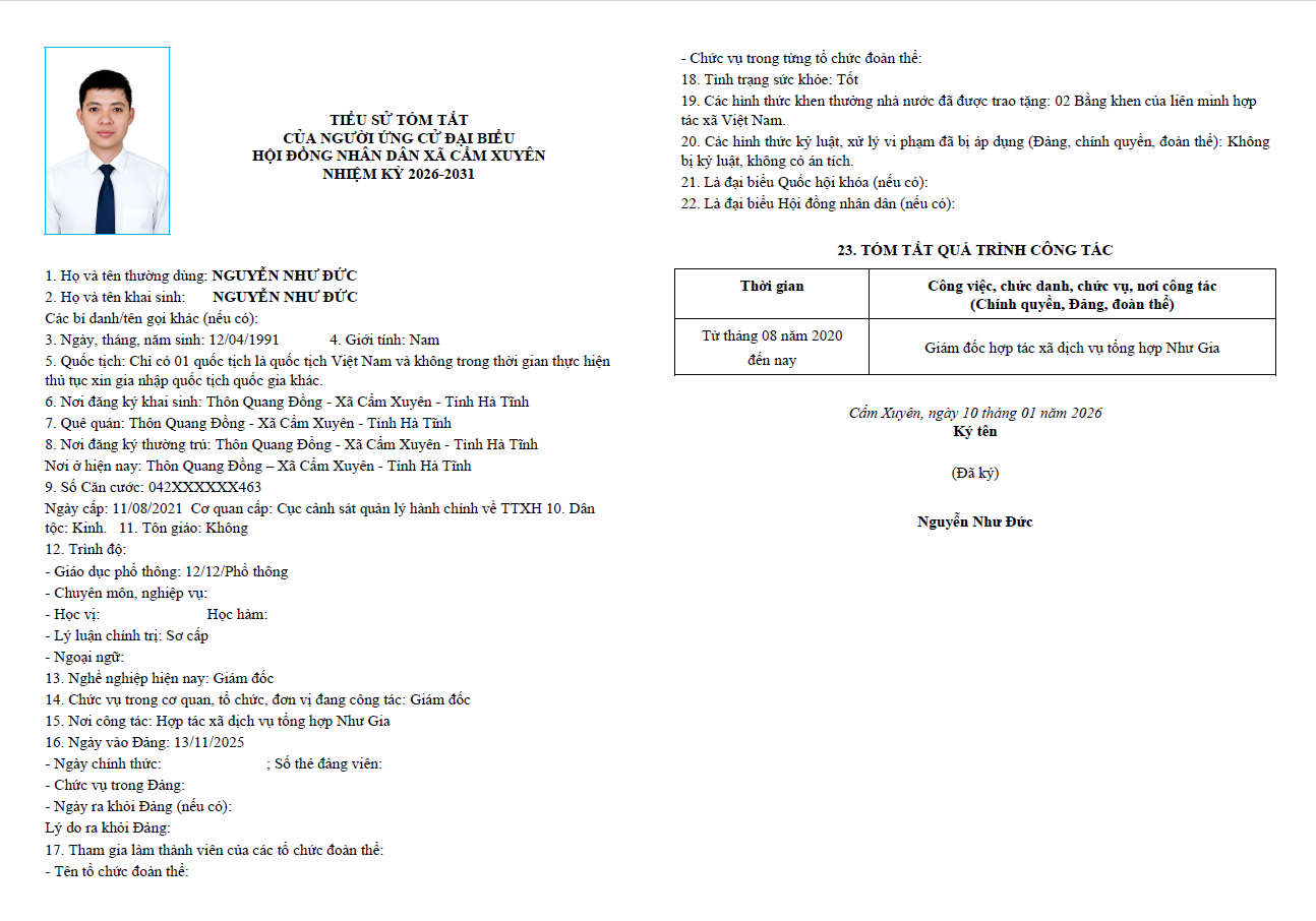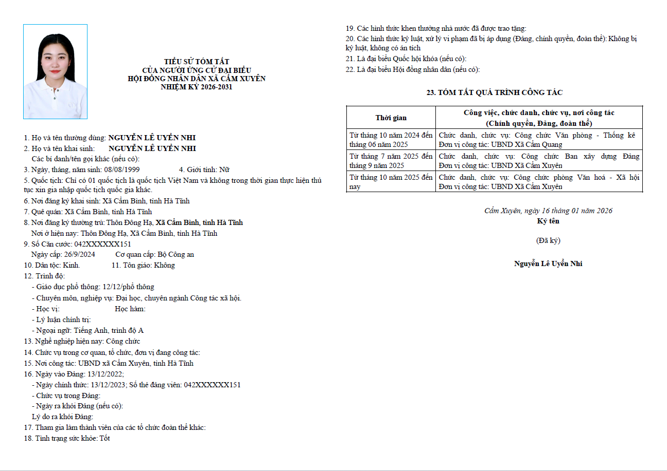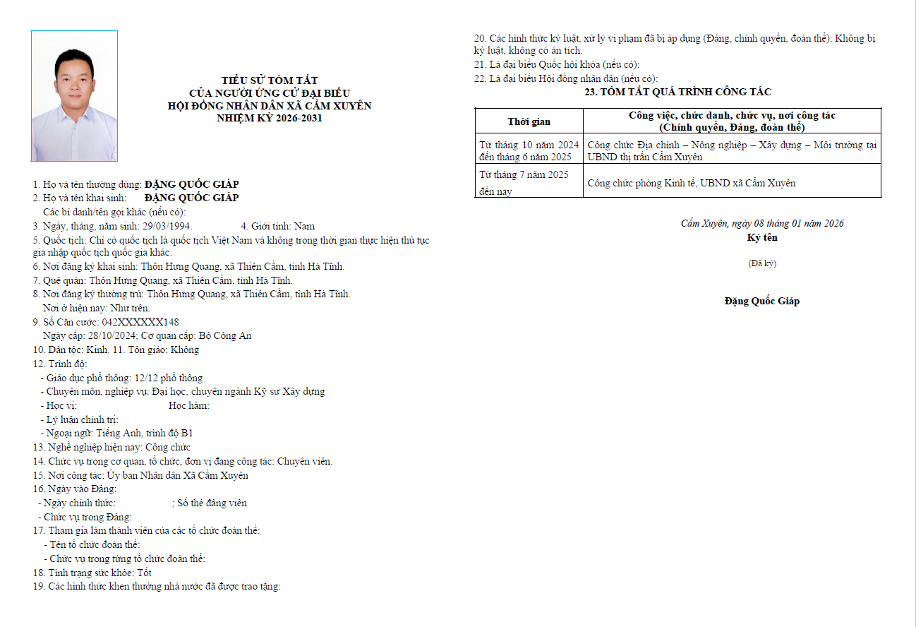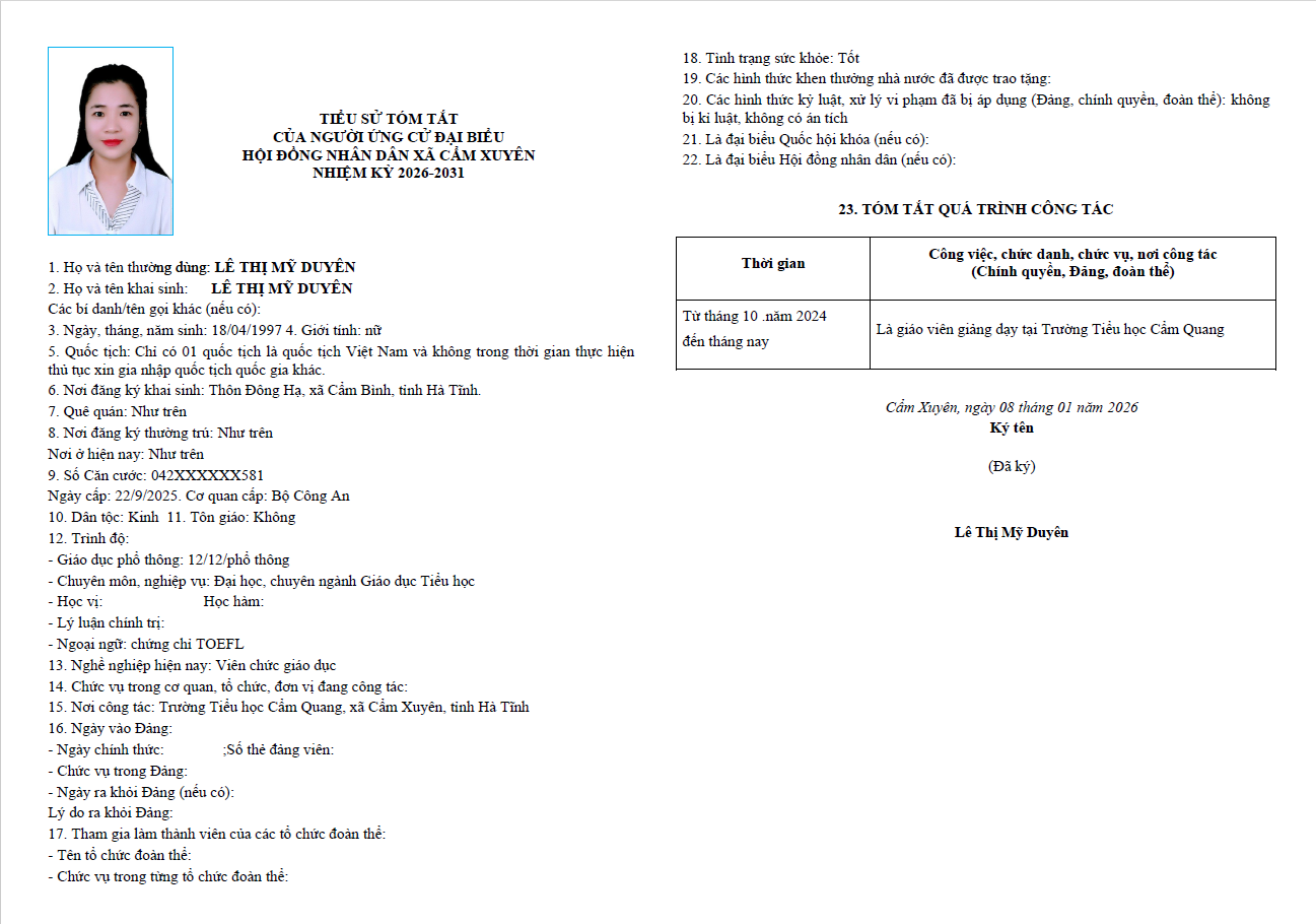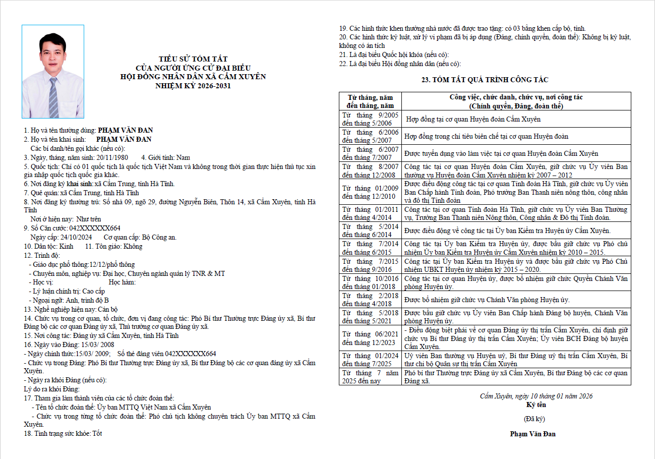Ủy ban bầu cử xã Cẩm Xuyên niêm yết công khai tiểu sử tóm tắt của 37 người ứng cử Đại biểu HĐND xã Cẩm Xuyên nhiệm kỳ 2026-2031 như sau: