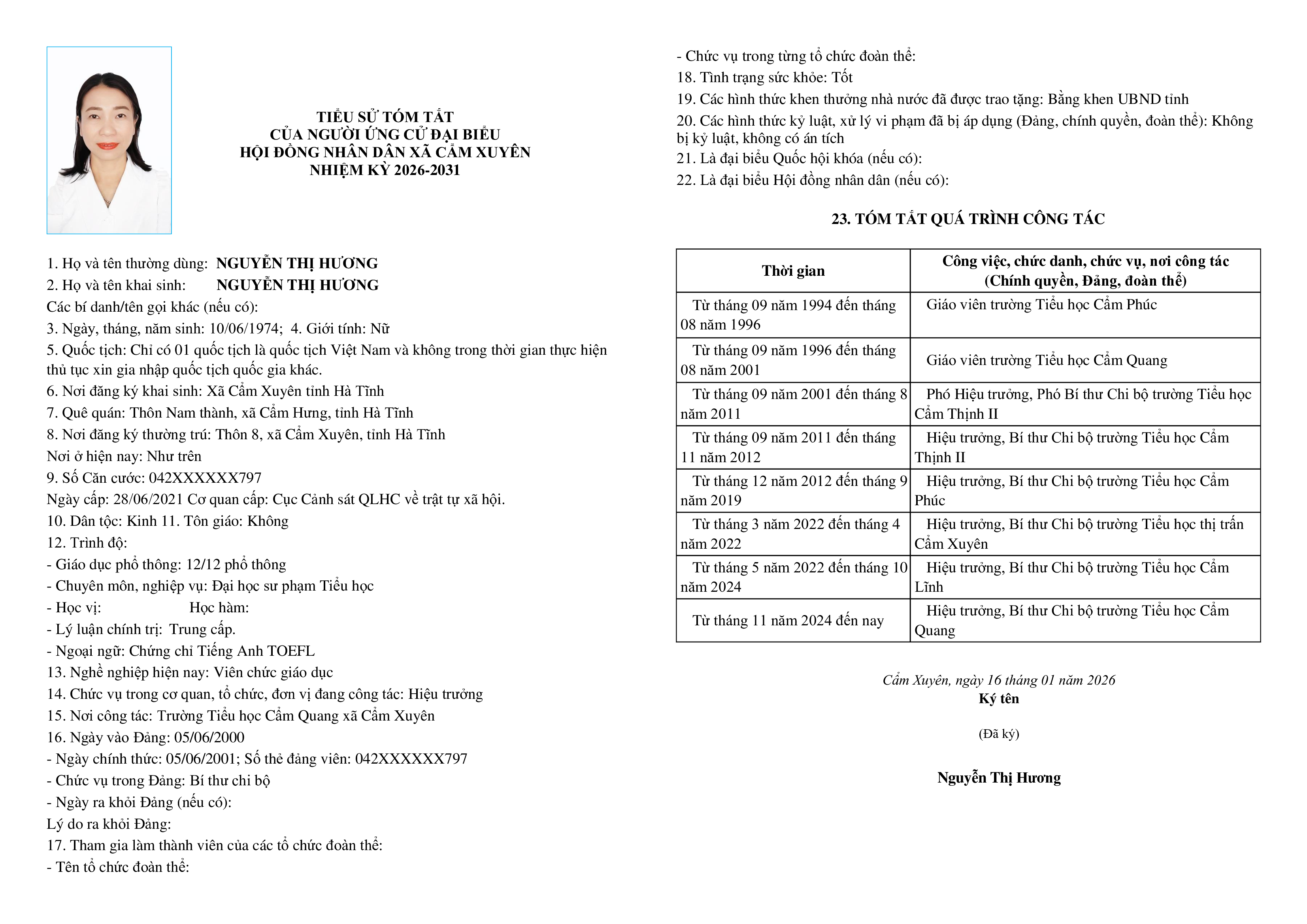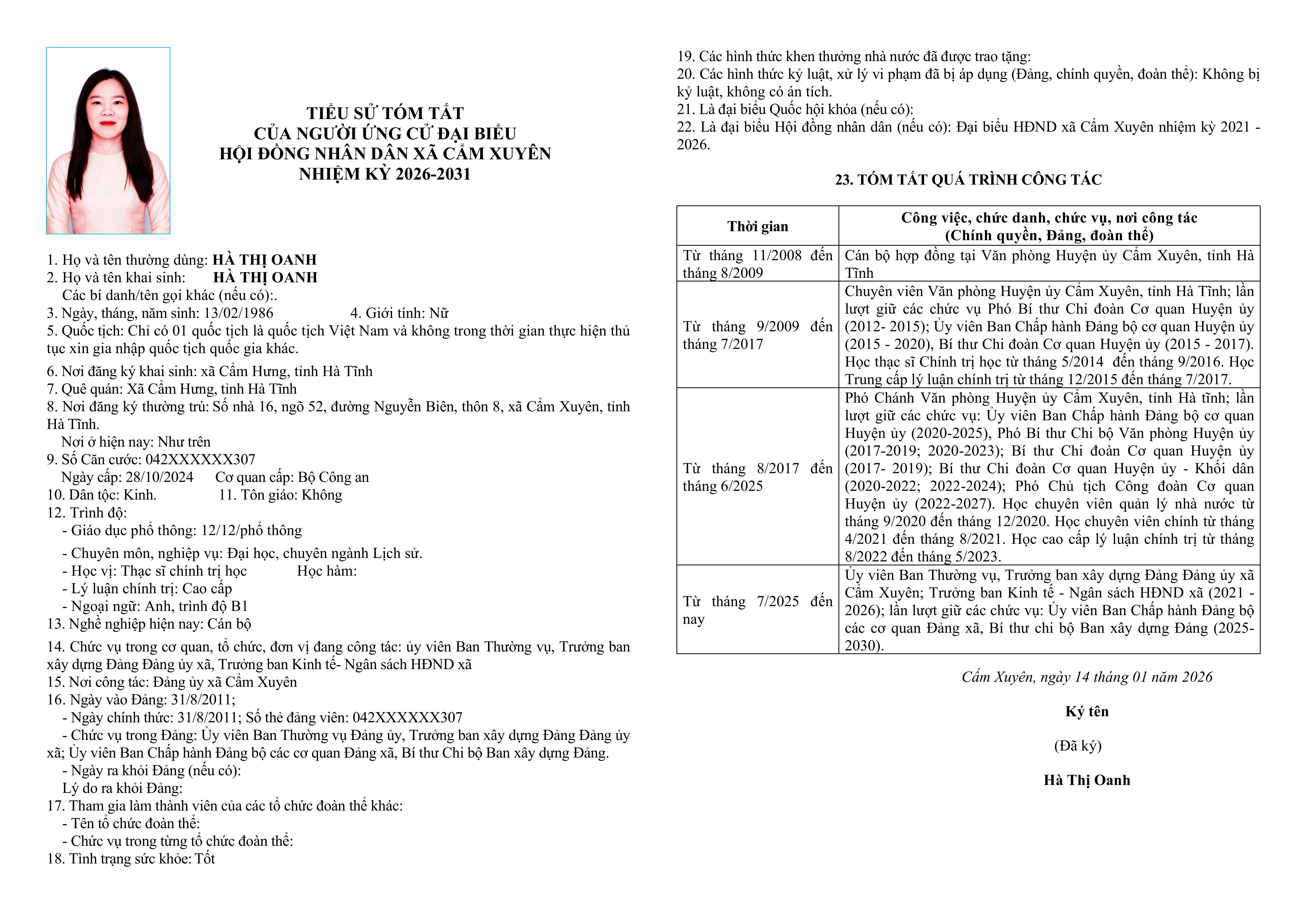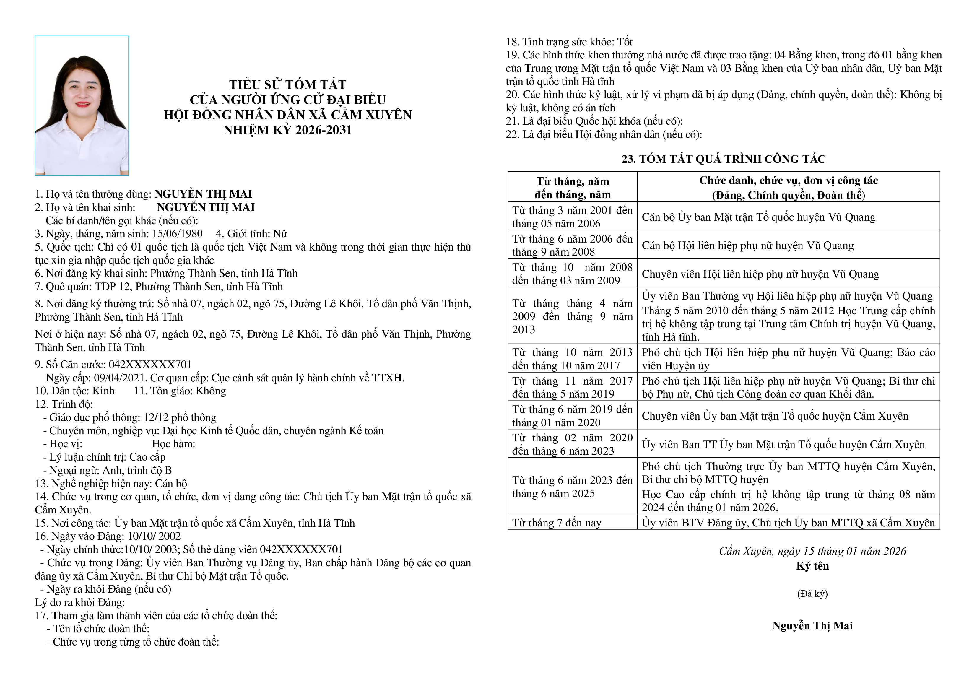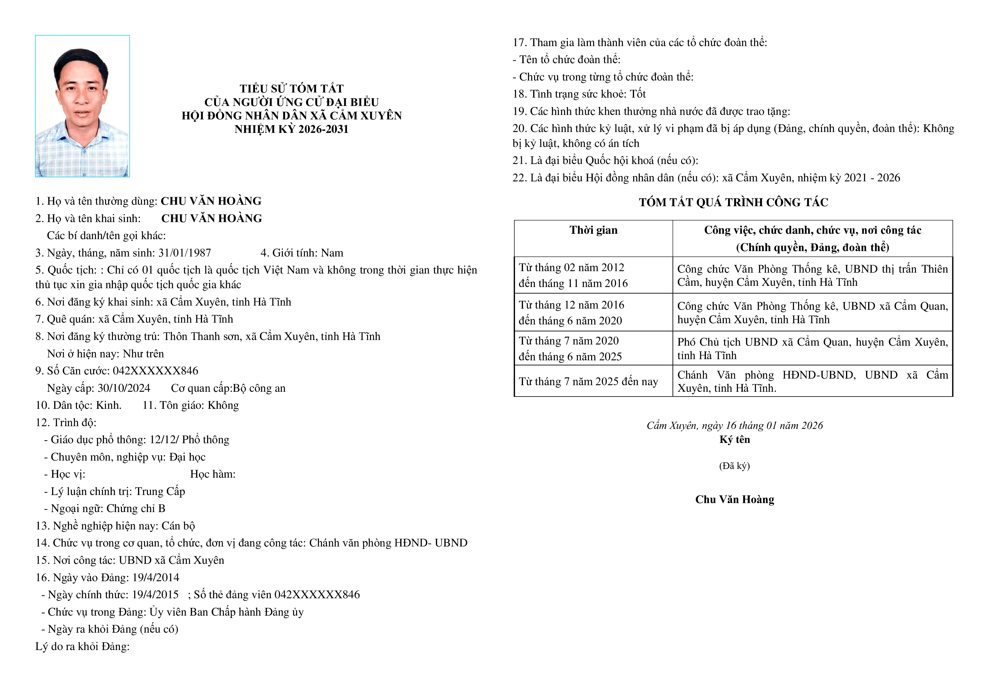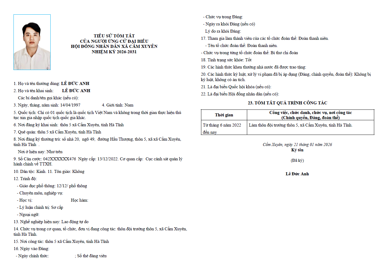 Ủy ban bầu cử xã Cẩm Xuyên niêm yết công khai tiểu sử tóm tắt của 37 người ứng cử Đại biểu HĐND xã Cẩm Xuyên nhiệm kỳ 2026-2031 như sau:
