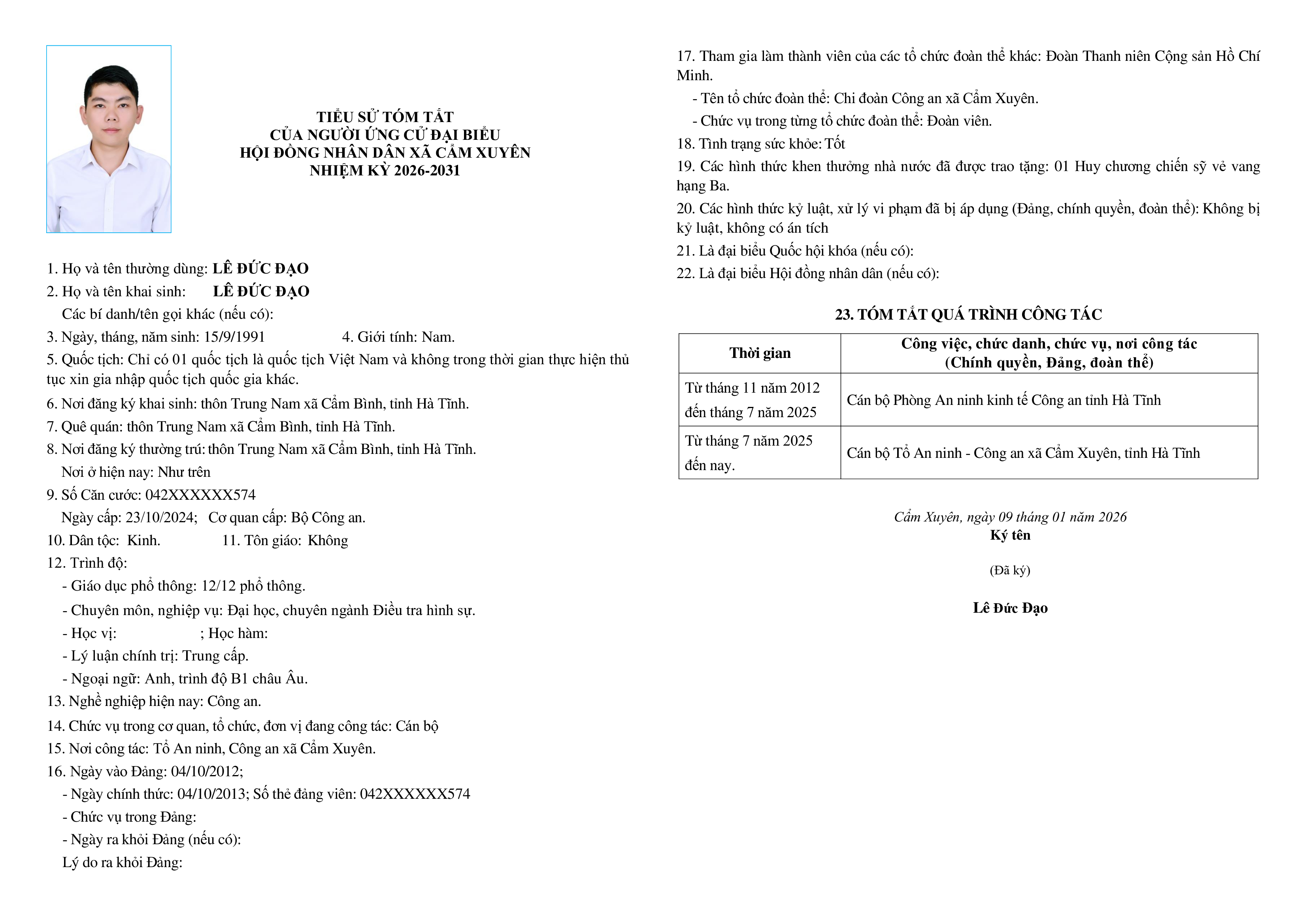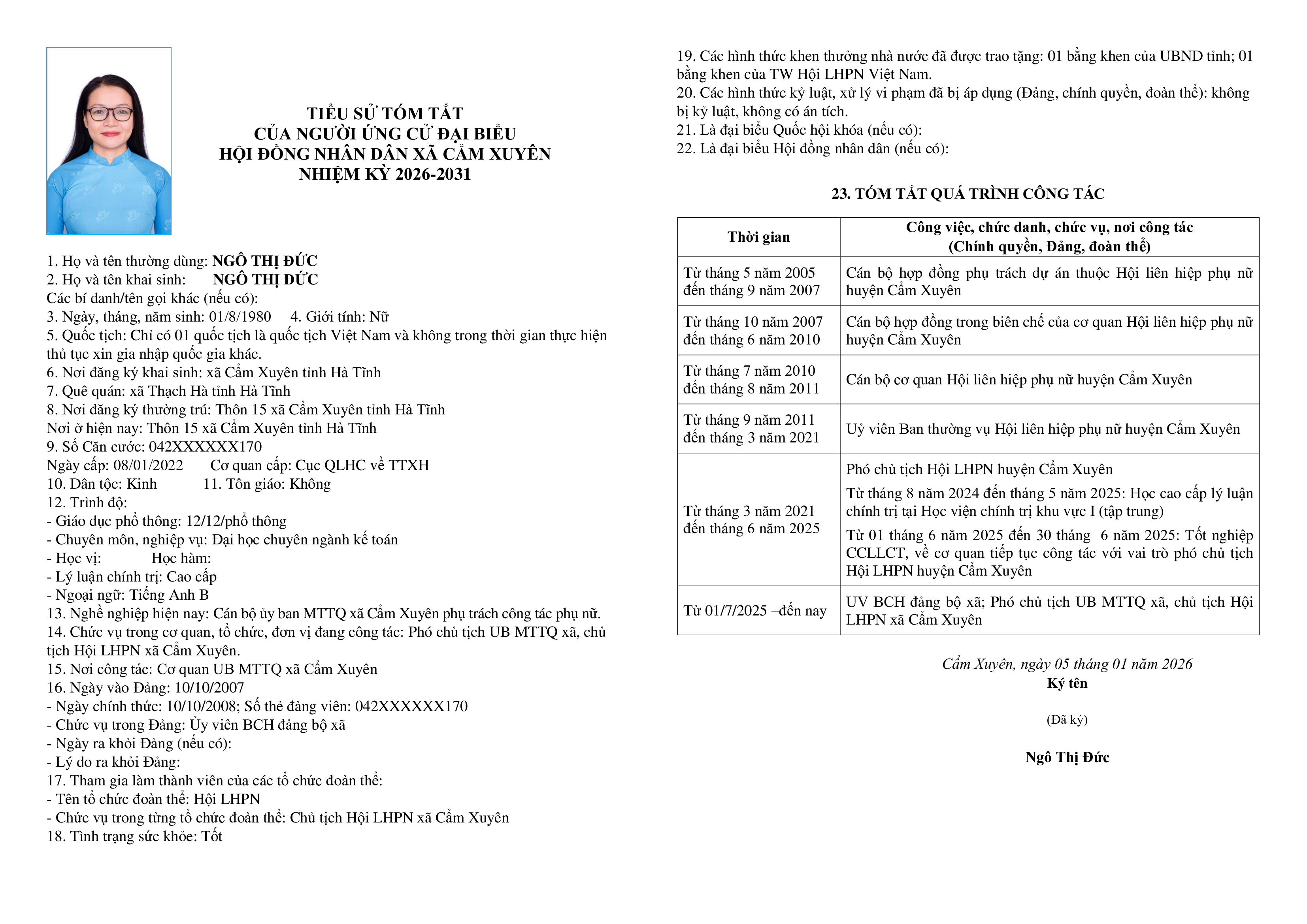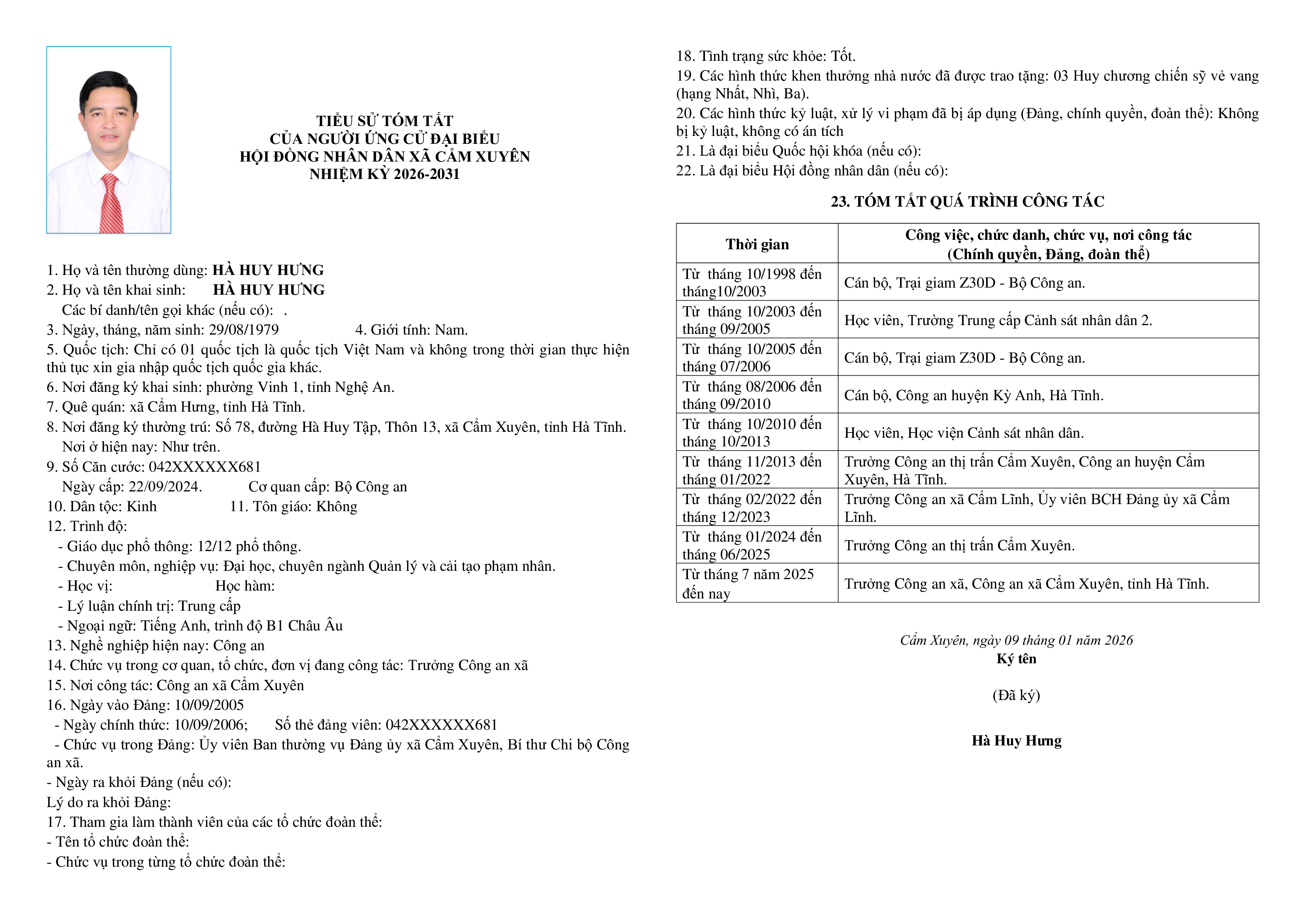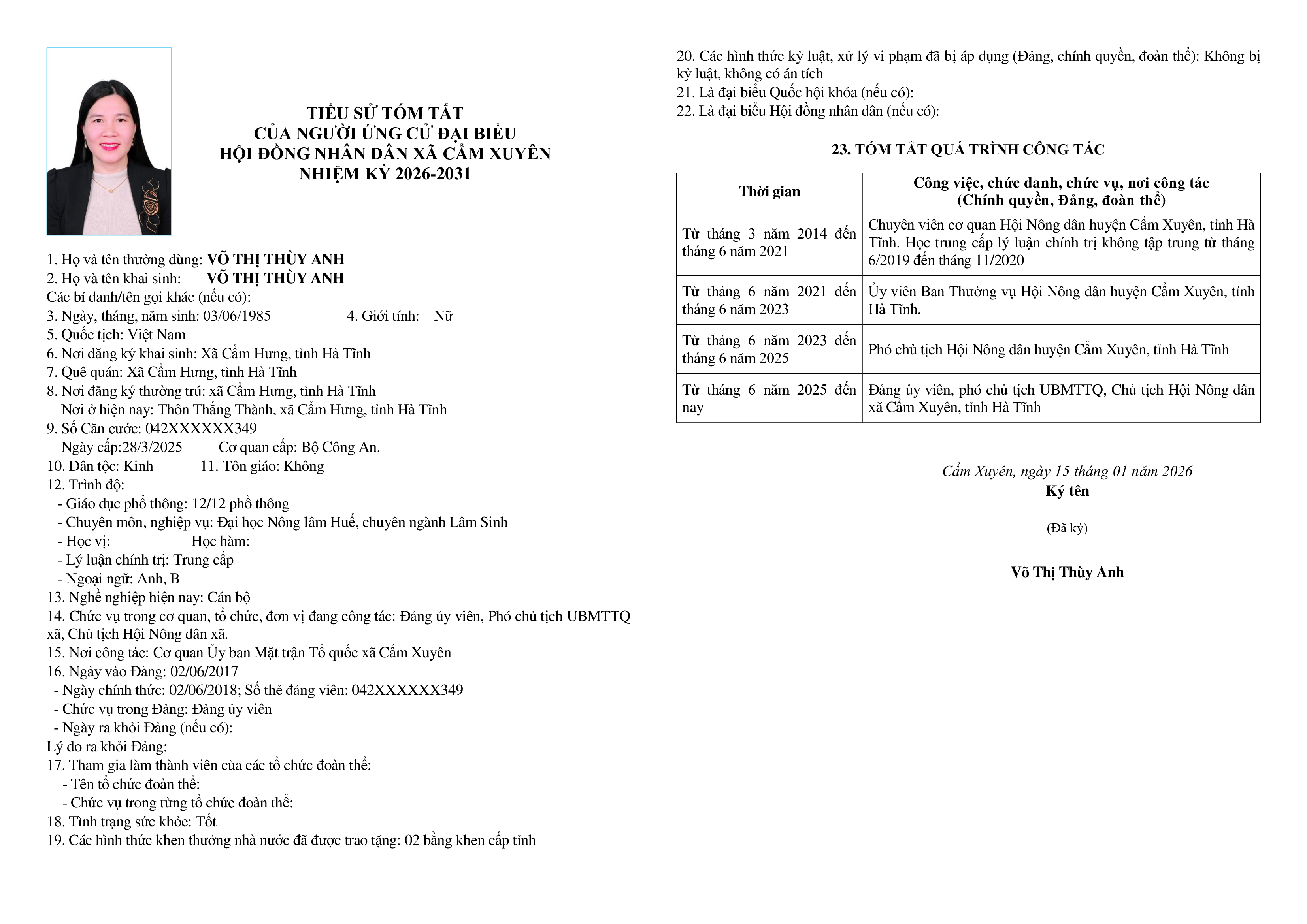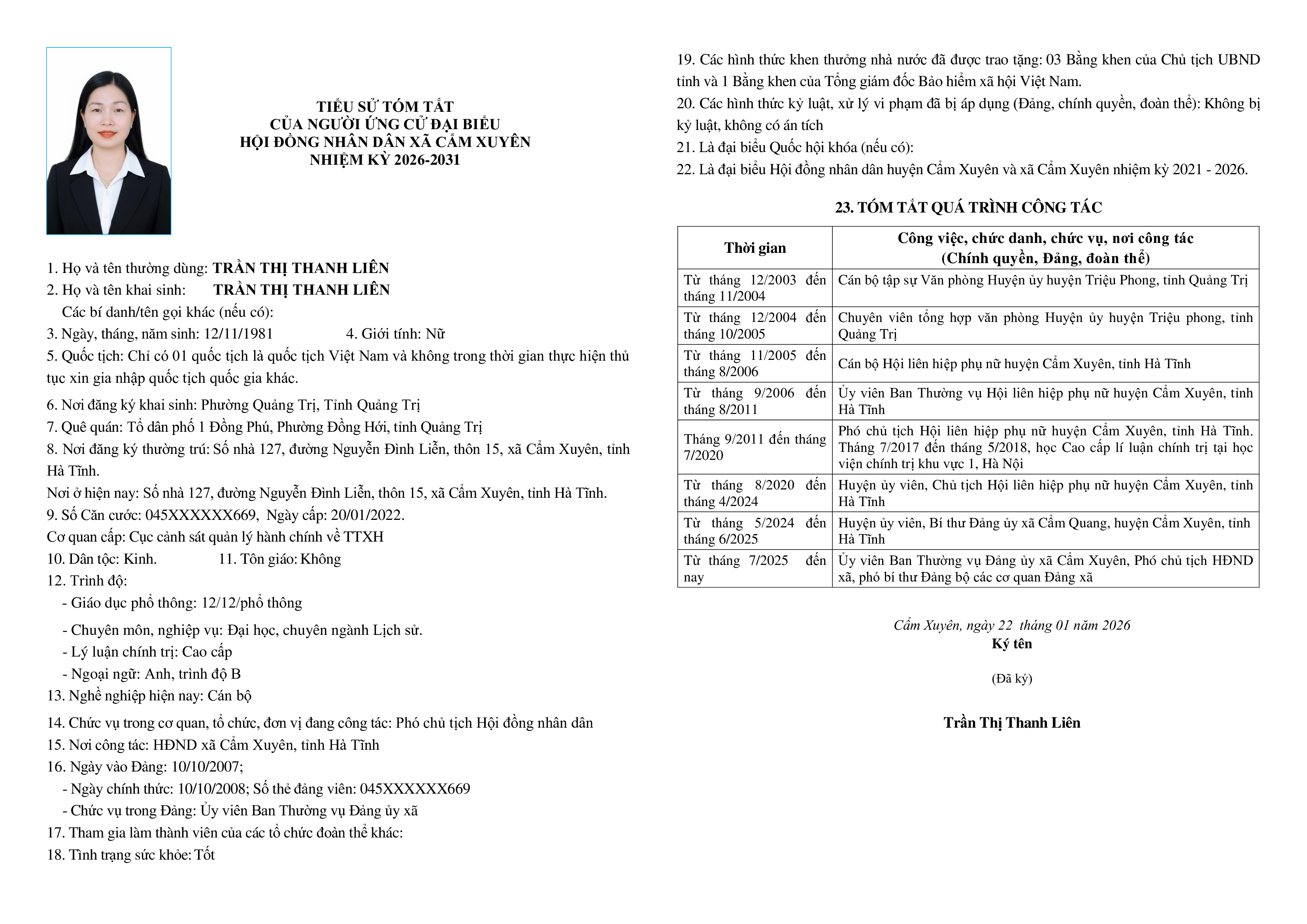 Ủy ban bầu cử xã Cẩm Xuyên niêm yết công khai tiểu sử tóm tắt của 37 người ứng cử Đại biểu HĐND xã Cẩm Xuyên nhiệm kỳ 2026-2031 như sau: