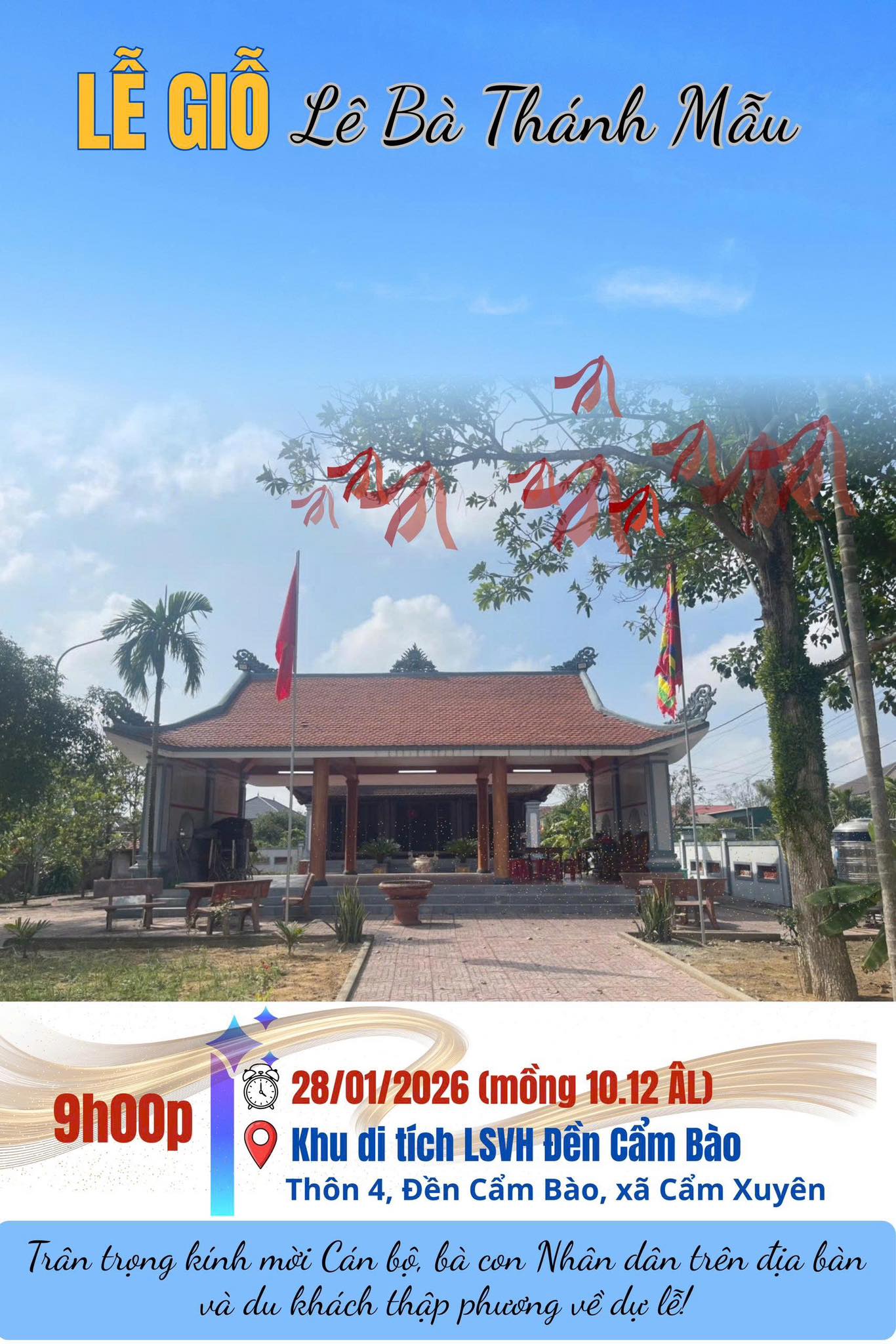 Kính mời các cấp chính quyền, cán bộ, nhân dân trong và ngoài địa phương, bà con đồng hương và du khách thập phương trở về Đền Cẩm Bào cùng dâng hương, tưởng nhớ và chia sẻ những khoảnh khắc trang trọng, ấm áp.