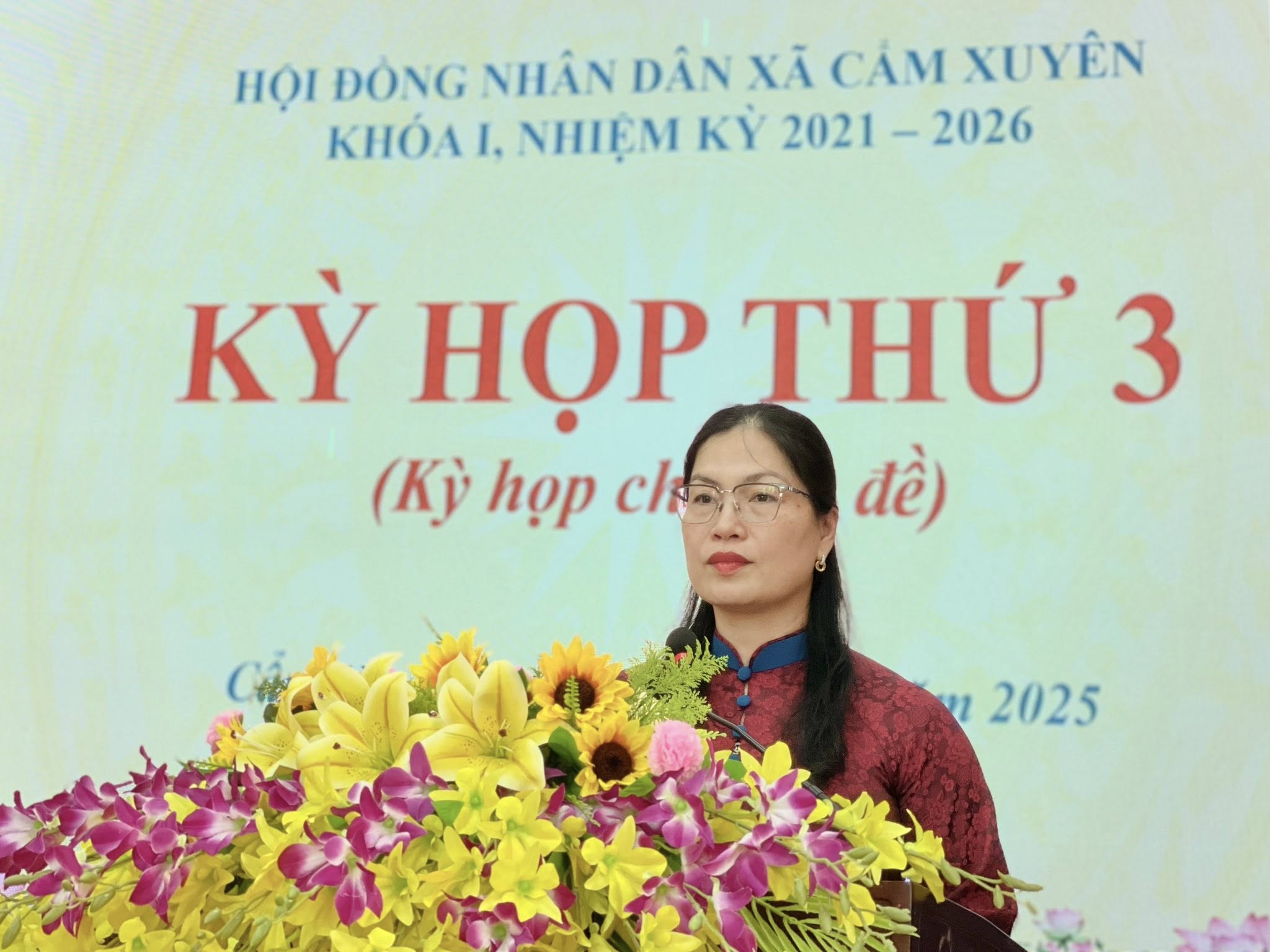 Chiều ngày 14/11/2025, tại hội trường Liên cơ UBND xã Cẩm Xuyên, Hội đồng nhân dân xã Cẩm Xuyên khóa I, nhiệm kỳ 2021–2026 đã tổ chức Kỳ họp thứ 3 (kỳ họp chuyên đề) nhằm xem xét và quyết nghị một số nội dung quan trọng thuộc thẩm quyền. Chủ tọa kỳ họp gồm đồng chí Trần Thị Thanh Liên – UVBTV Đảng ủy, Phó Chủ tịch HĐND xã và hai Trưởng ban HĐND xã.