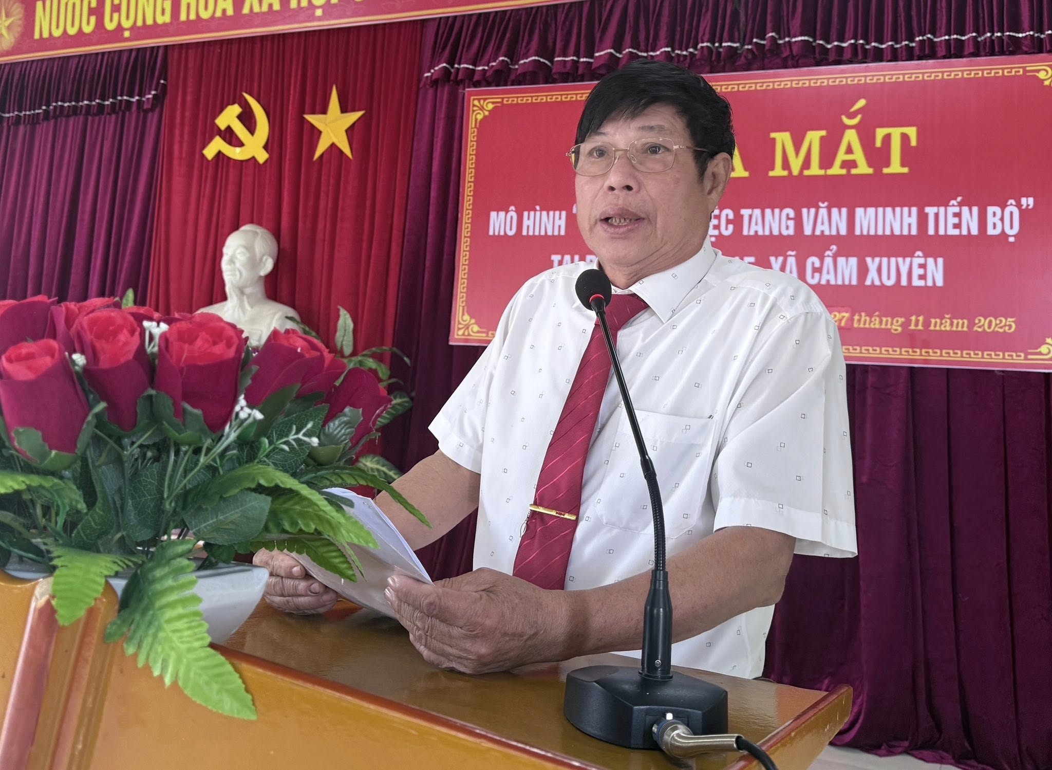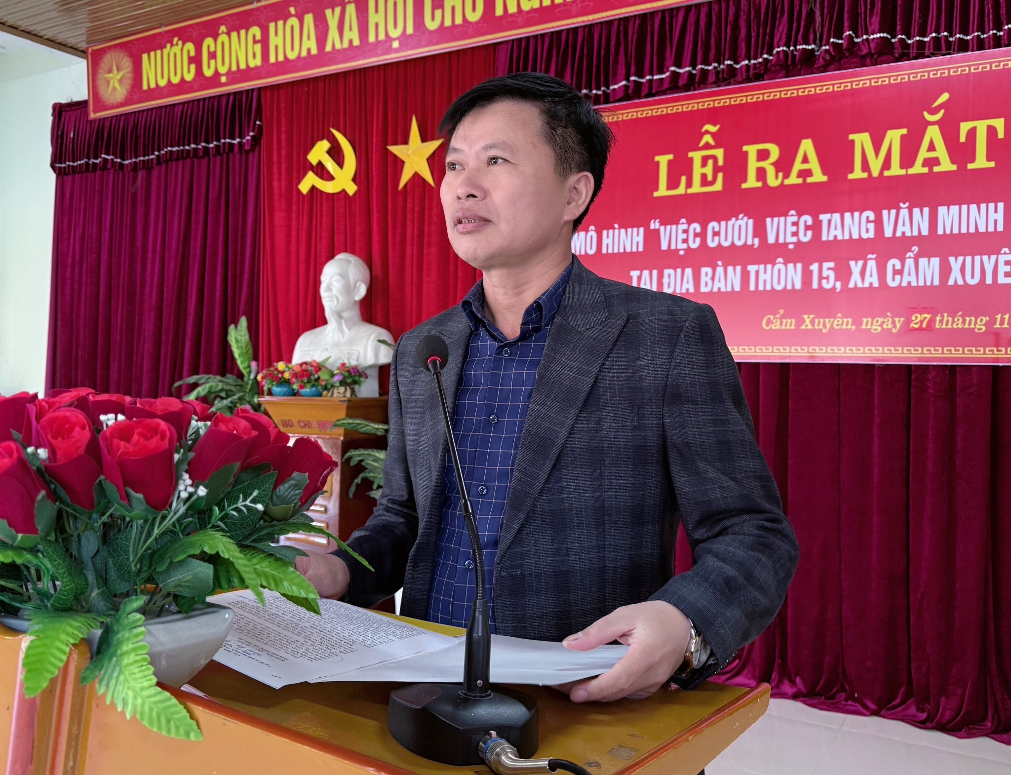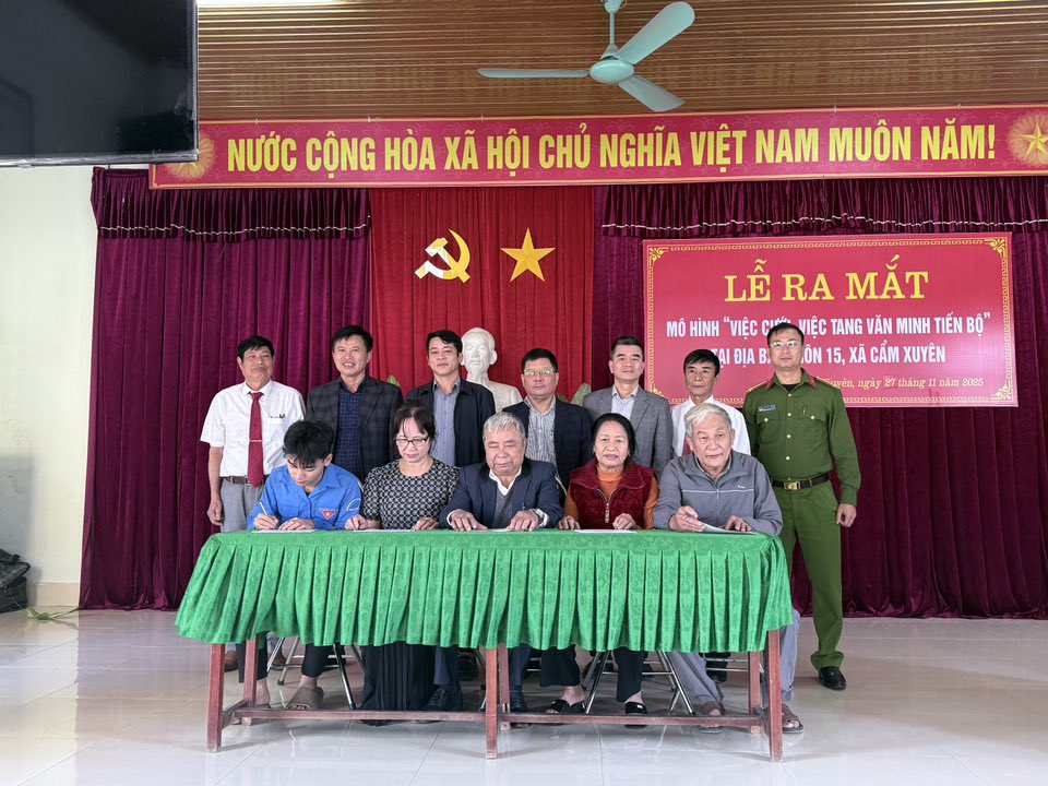 Chiều ngày 27/11/2025, xã Cẩm Xuyên, tỉnh Hà Tĩnh tổ chức Lễ ra mắt mô hình "Việc cưới, việc tang văn minh tiến bộ" tại thôn 15. Dự buổi lễ ở tỉnh có đồng chí Trần Viết Hiệu - Trưởng phòng quản lý TDTT tỉnh, Sở Văn hóa, thể thao và Du lịch tỉnh Hà Tĩnh; ở xã có đồng chí Phạm Văn Đan - Phó bí thư Thường trực Đảng uỷ ; đồng chí Phan Trọng Bình - Phó Bí thư Đảng ủy, Chủ tịch UBND xã; đồng chí Nguyễn Thị Mai - Uỷ viên BTV, Chủ tịch UBMTTQ xã, đồng chí Nguyễn Văn Chiến - Uỷ viên BTV, Phó chủ tịch UBND xã; các đồng chí Ủy viên BTV Đảng ủy ,Thường trực HĐND, lãnh đạo UBND, Uỷ ban MTTQ, lãnh đạo các phòng chuyên môn,các tổ chức chính trị- xã hội xã; Bí thư, Thôn trưởng các thôn trên địa bàn; và toàn thể cán bộ, nhân dân thôn 15 cùng tham dự.