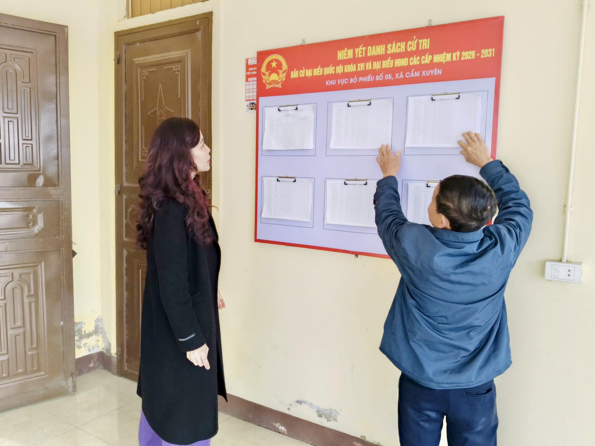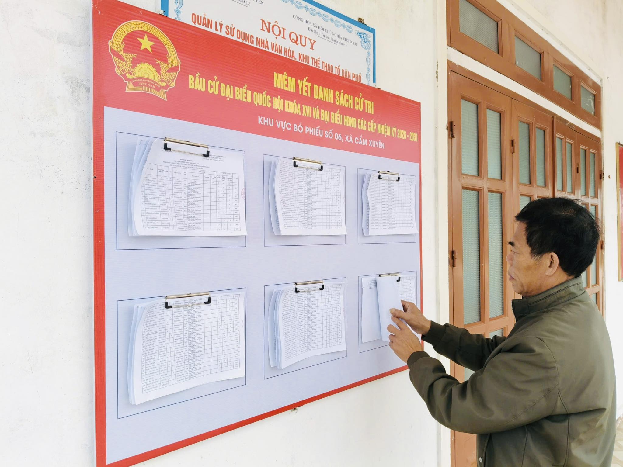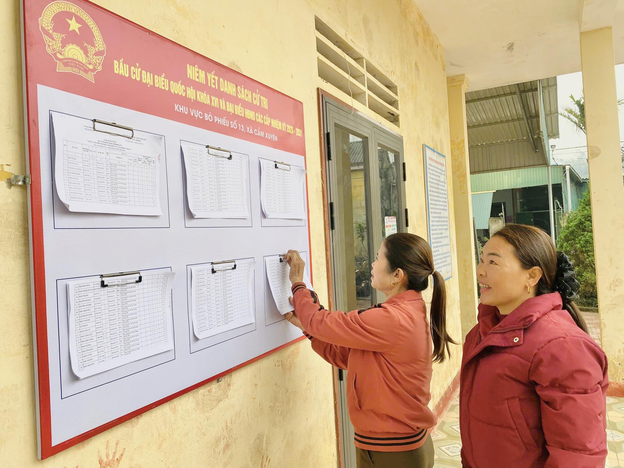 Danh sách cử tri trên địa bàn xã Cẩm Xuyên đã được lập đầy đủ và niêm yết công khai tại 17 khu vực bỏ phiếu thuộc 33 thôn. Việc niêm yết danh sách cử tri tại các khu vực bỏ phiếu đã hoàn thành 100% vào lúc 17 giờ 00 phút, ngày 02/02/2026, bảo đảm công khai, minh bạch, thuận tiện để Nhân dân tiếp cận, kiểm tra và thực hiện quyền, nghĩa vụ công dân trong cuộc bầu cử sắp tới.