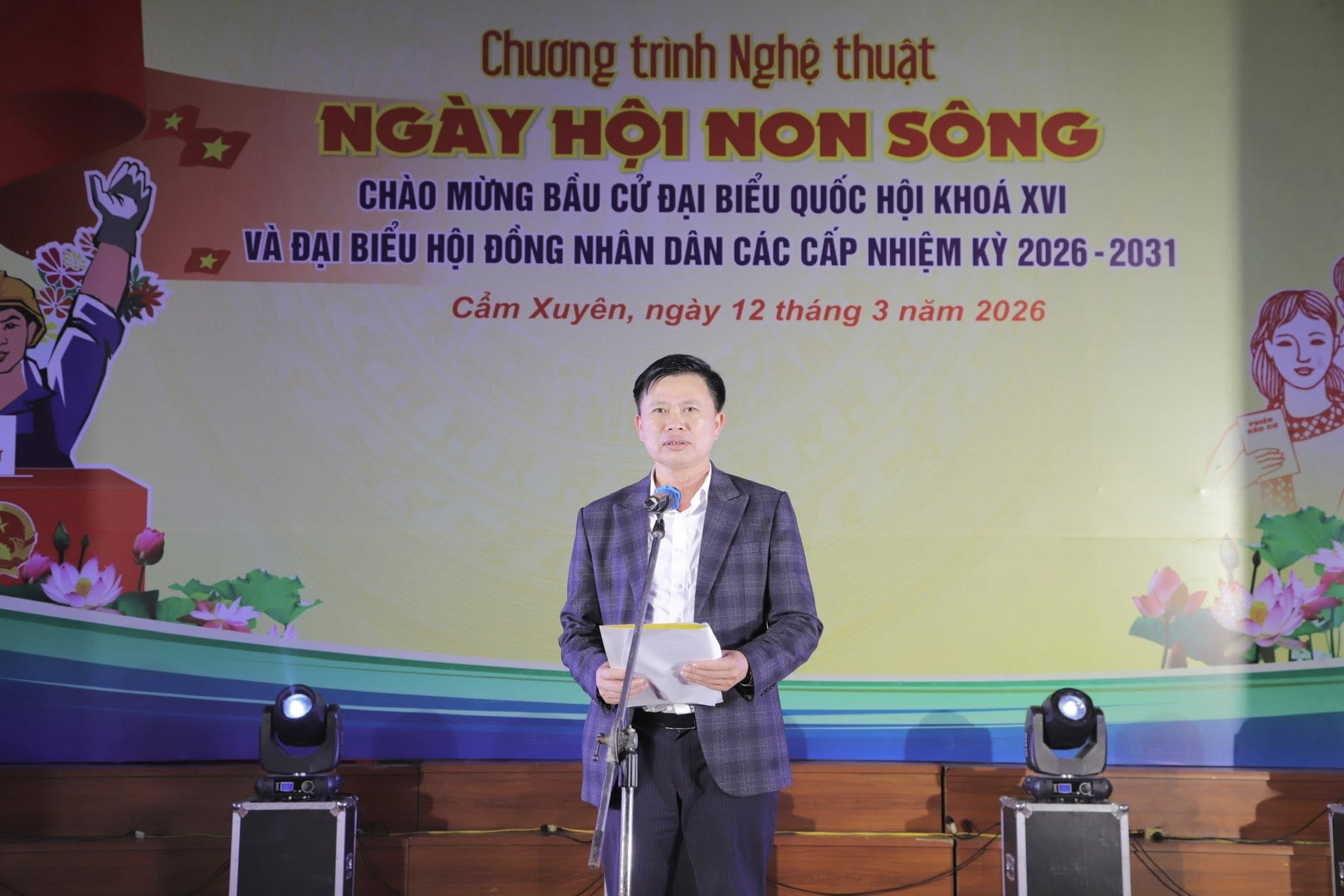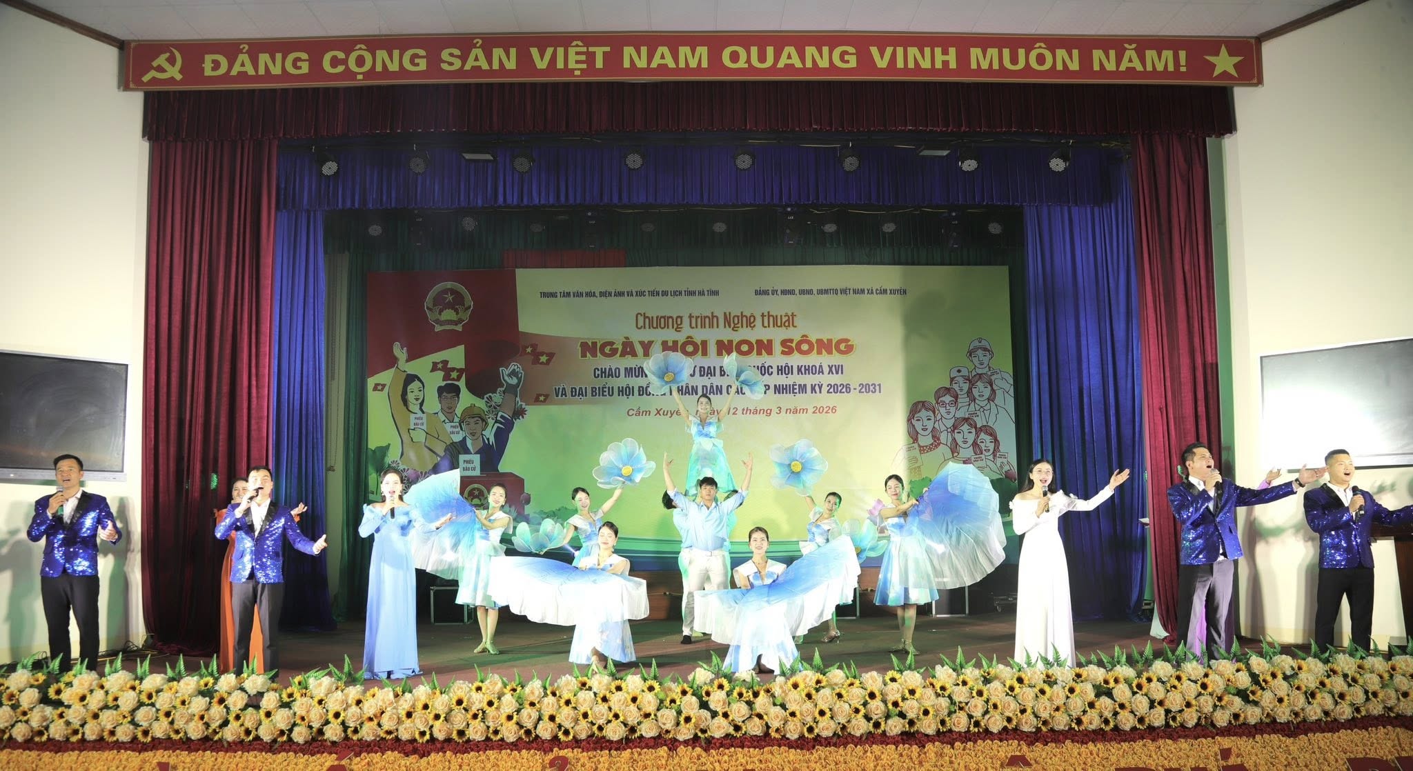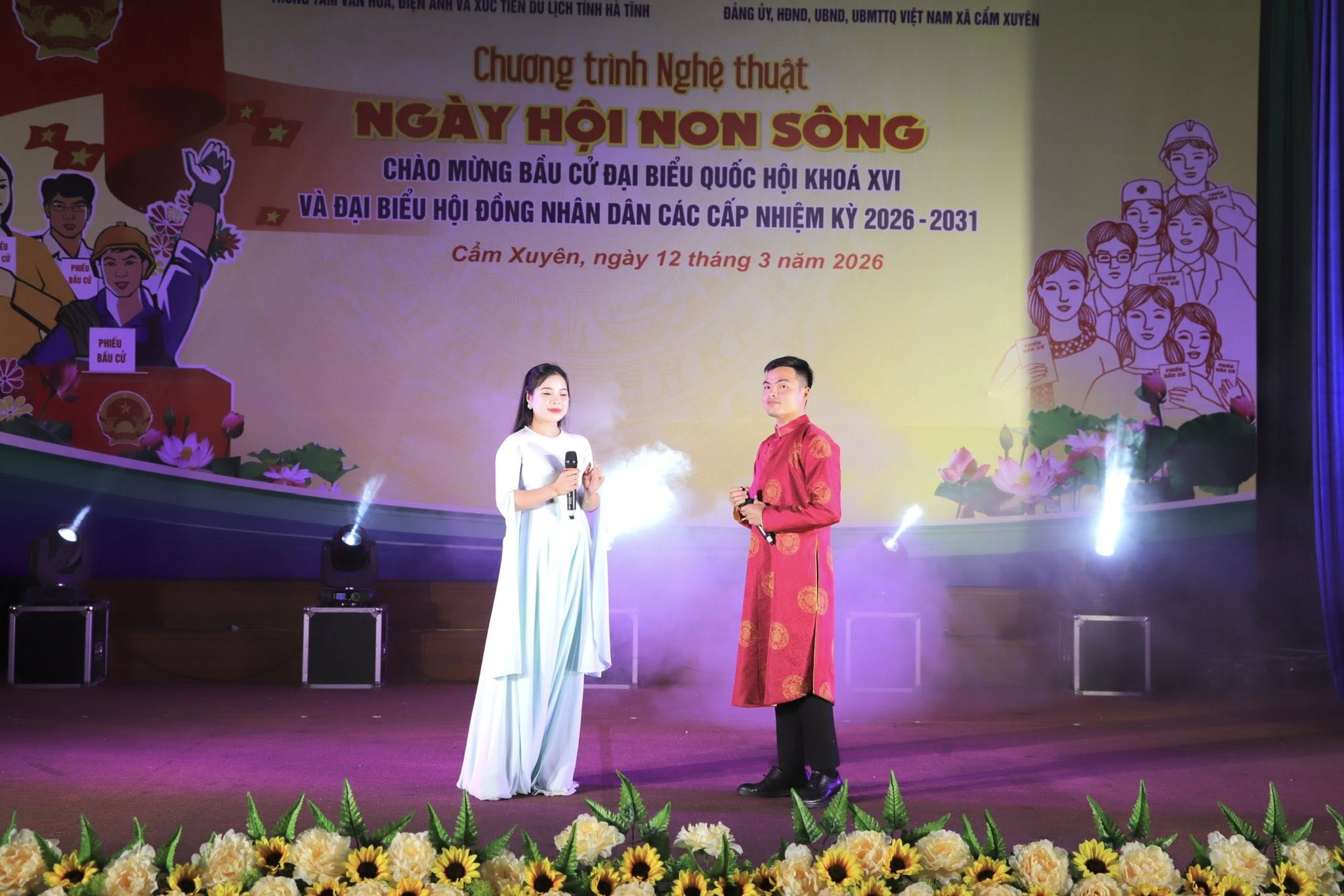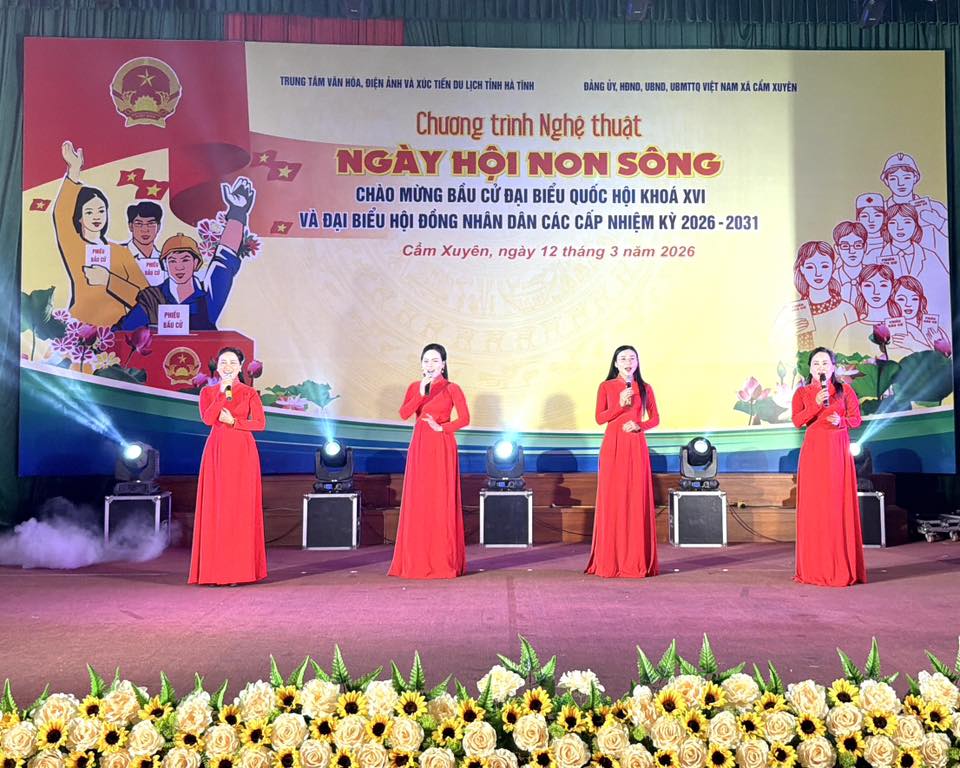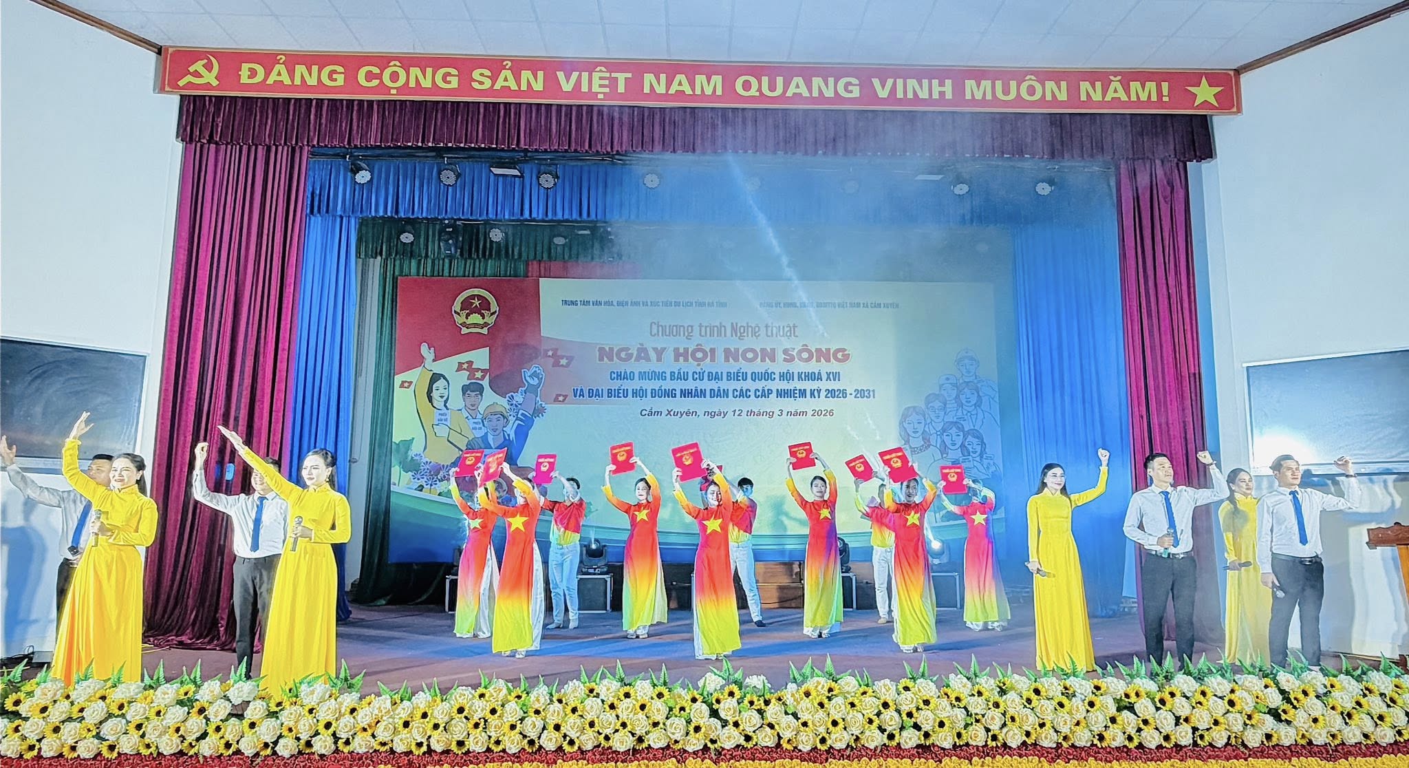 Hòa trong không khí phấn khởi chào mừng cuộc bầu cử đại biểu Quốc hội khóa XVI và bầu cử đại biểu HĐND các cấp nhiệm kỳ 2026 – 2031, tối ngày 12/3/2026, UBND xã Cẩm Xuyên, tỉnh Hà Tĩnh phối hợp với Trung tâm Văn hóa, Điện ảnh và Xúc tiến Du lịch tỉnh Hà Tĩnh tổ chức chương trình nghệ thuật tuyên truyền với chủ đề “Ngày hội non sông”.