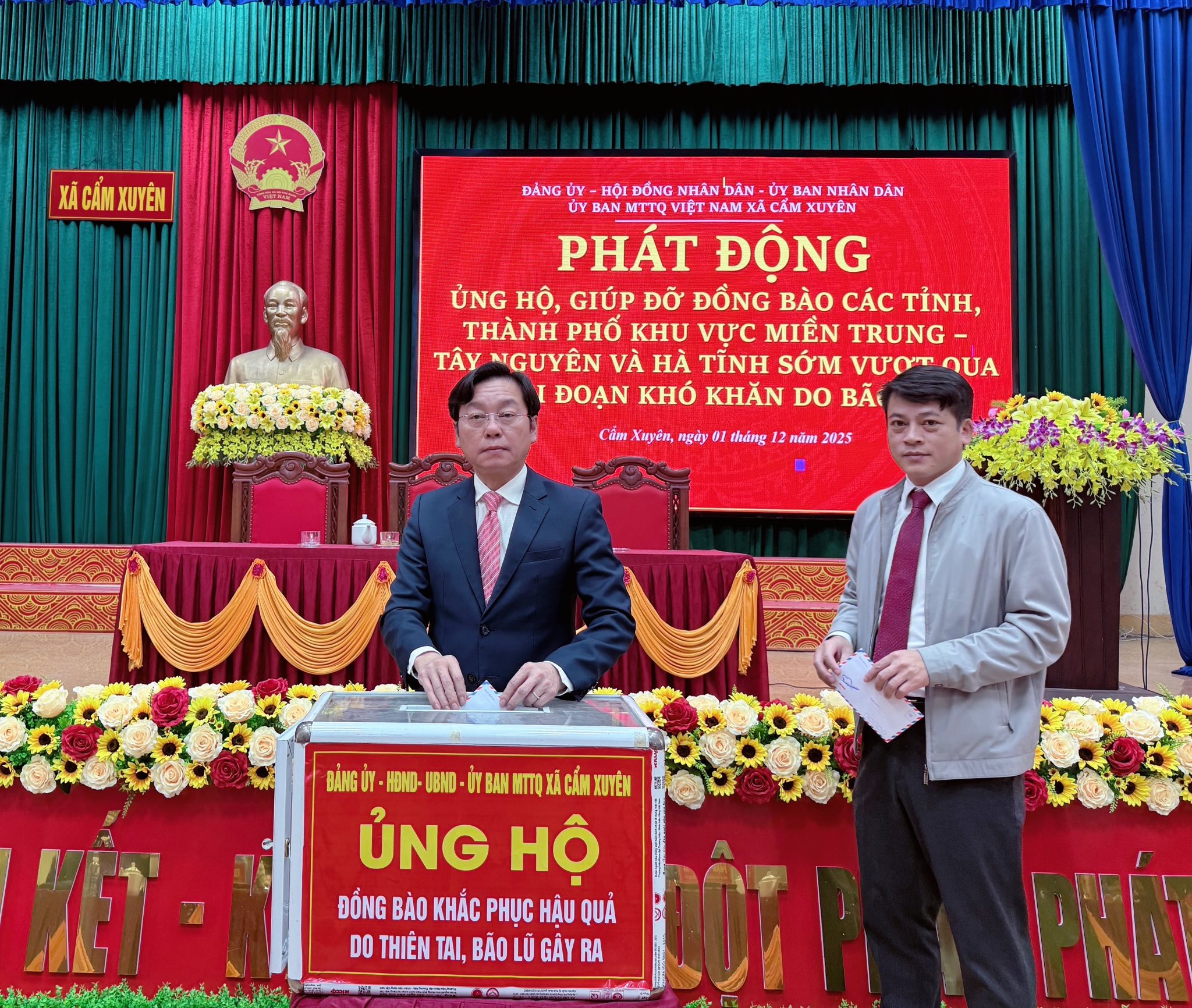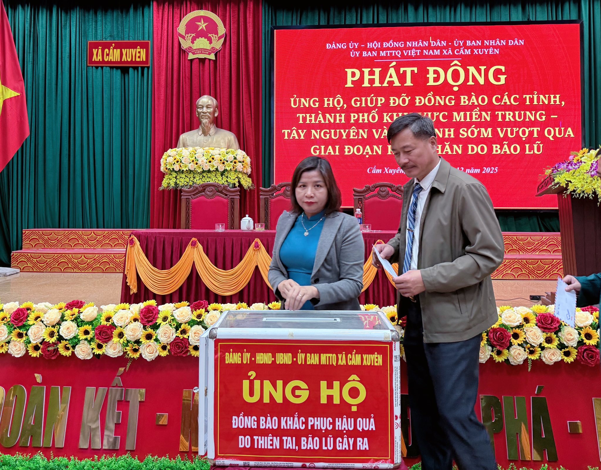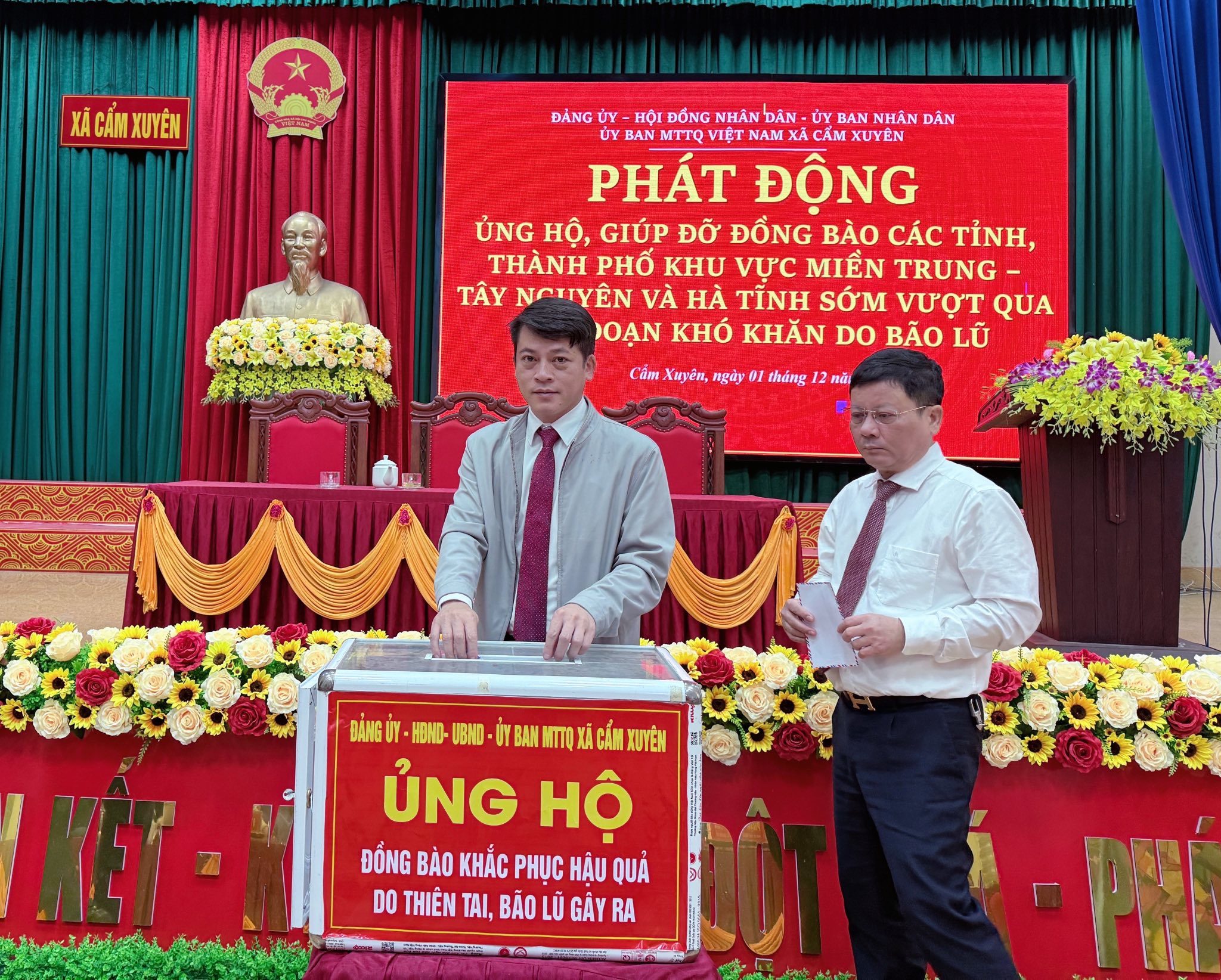 Phát huy truyền thống đại đoàn kết toàn dân tộc và tinh thần tương thân tương ái của dân tộc Việt Nam, hưởng ứng lời kêu gọi của Đoàn Chủ tịch Ủy ban Trung ương MTTQ Việt Nam về vận động ủng hộ đồng bào khắc phục thiệt hại do thiên tai, lũ lụt gây ra; Ban Thường trực Ủy ban MTTQ Việt Nam xã Cẩm Xuyên đã phát động cán bộ, công chức, viên chức người lạo động, lực lượng vũ trang, cơ quan, đơn vị, tổ chức, doanh nghiệp và các tầng lớp Nhân dân tham gia quyên góp ủng hộ cùng chung tay chia sẻ, ủng hộ, giúp đỡ, đồng bào các tỉnh và thành phố khu vực miền Trung Tây Nguyên, trong đó có Hà Tĩnh, góp phần chia sẻ khó khăn,hỗ trợ người dân sớm ổn định cuộc sống và khắc phục hậu quả thiên tai.